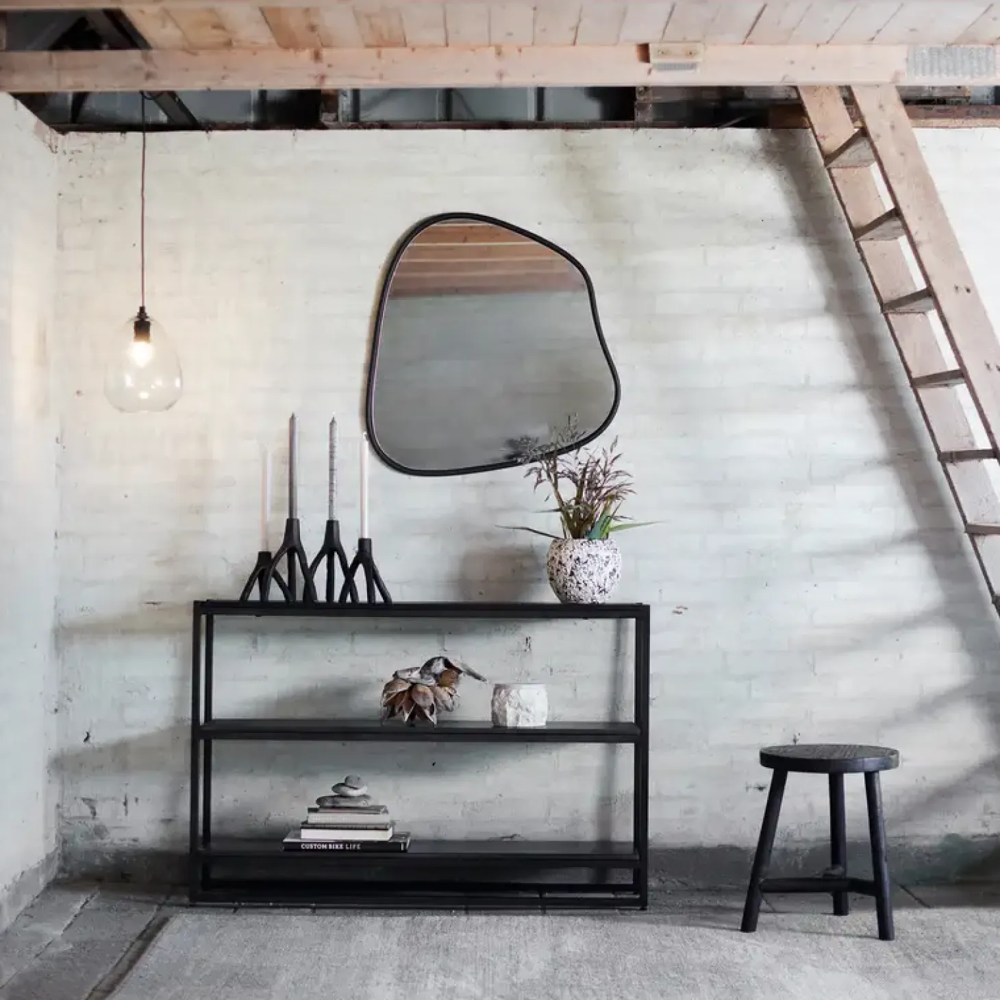 Spejlet inviterer til at lade flydende former berige indretningen, hvilket gør spejlet til et dekorativt vægelement. Spejlet kombinerer organiske former med et klassisk design i metalramme.