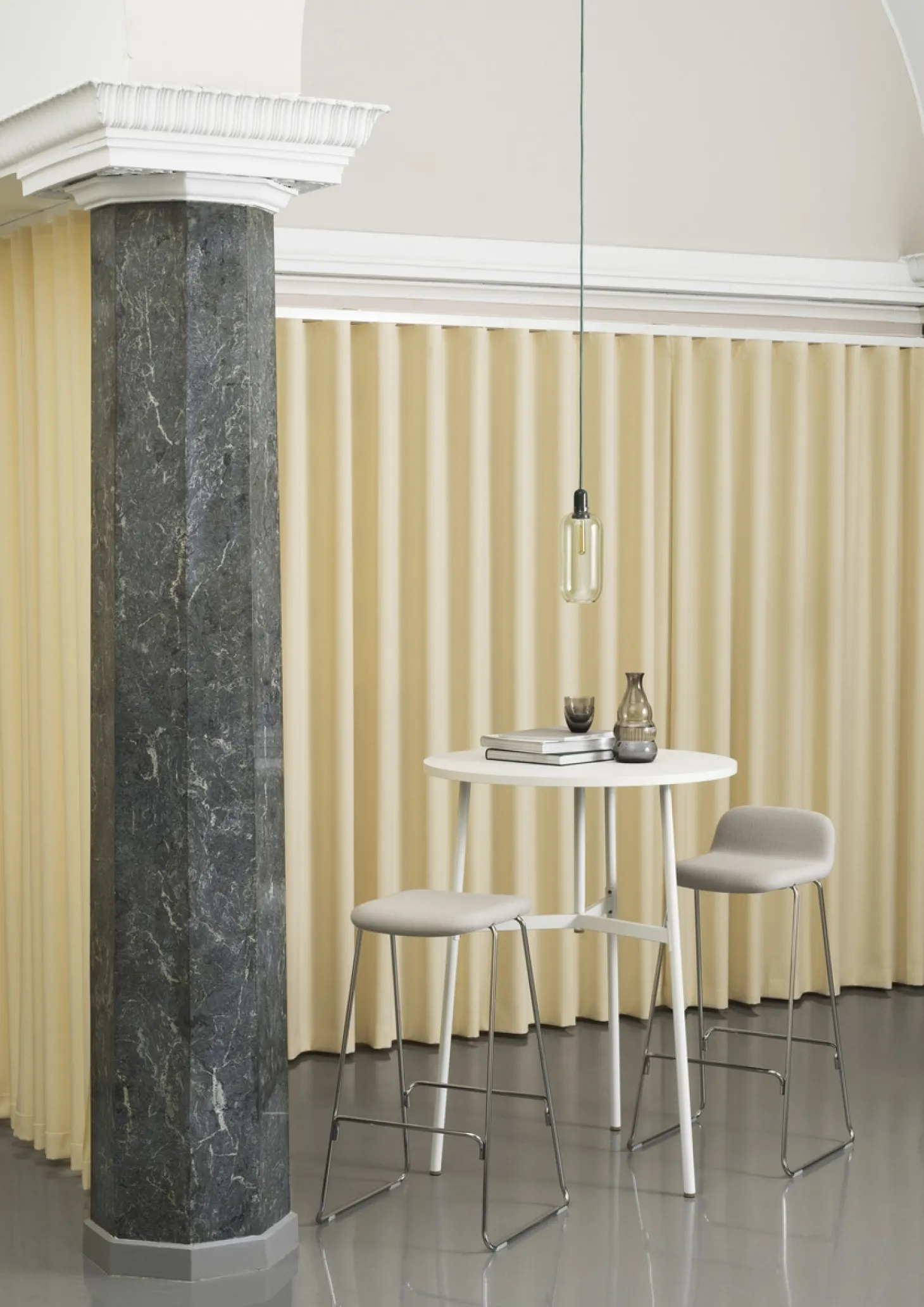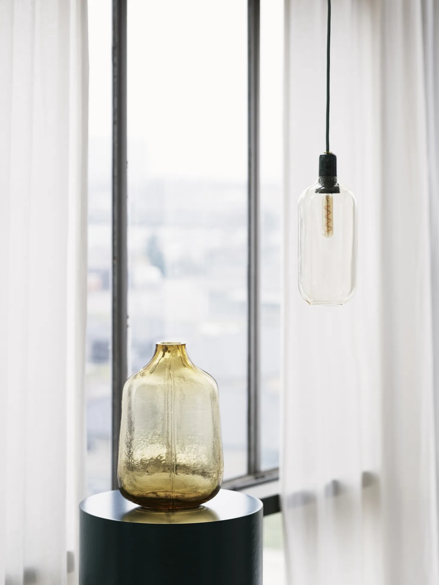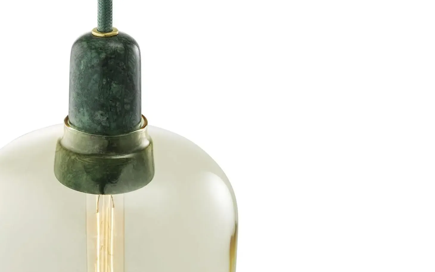 Amp er en serie af små lamper inspireret af gamle rørforstærkere fra 1960’erne. De unikke former og klassiske materialer af marmor og glas tilføjer en nostalgisk og samtidig moderne følelse til Amp. Den dekorative pære udsender en fantastisk glød gennem de guld/grønne og røg/sorte glasskærme, mens uigennemsigtigheden af det hvide/hvide glas fremhæver lampens form, så den fremstår som en ren og spøgelsesagtig æstetisk silhuet. Lampekollektionen producerer et smukt og behageligt lys, og det sofistikerede design kan indgå i mange forskellige boligindretninger. Hæng en Amp-lampe i gangen, i et hjørne af stuen, eller skab en klynge af Amp-lamper over dit spisebord for en moderne balsaleffekt. Designet af Simon Legald