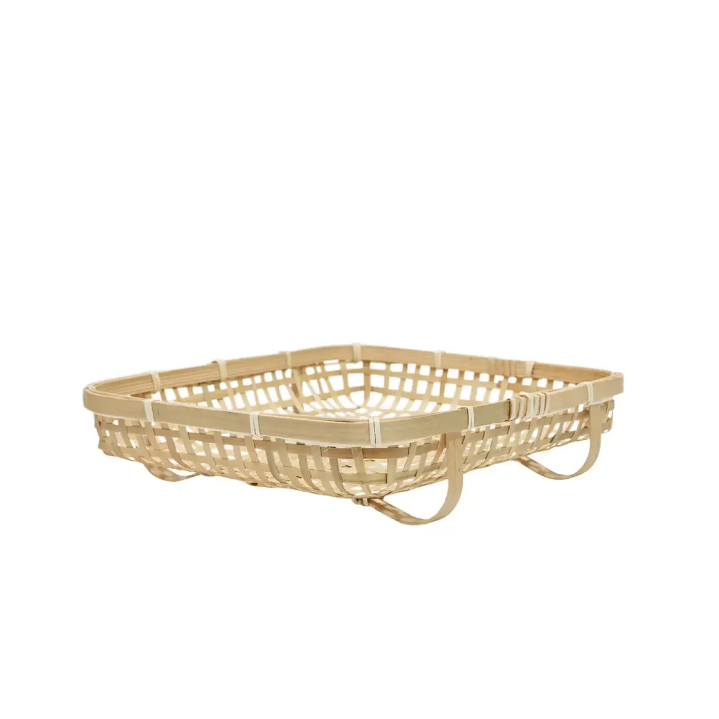 Håndlavet brødkurv i flettet bambus, der kombinerer naturlige materialer med praktisk design. Med målene 25 x 30 x 6 cm giver kurven god plads til dagens brød og bagværk.