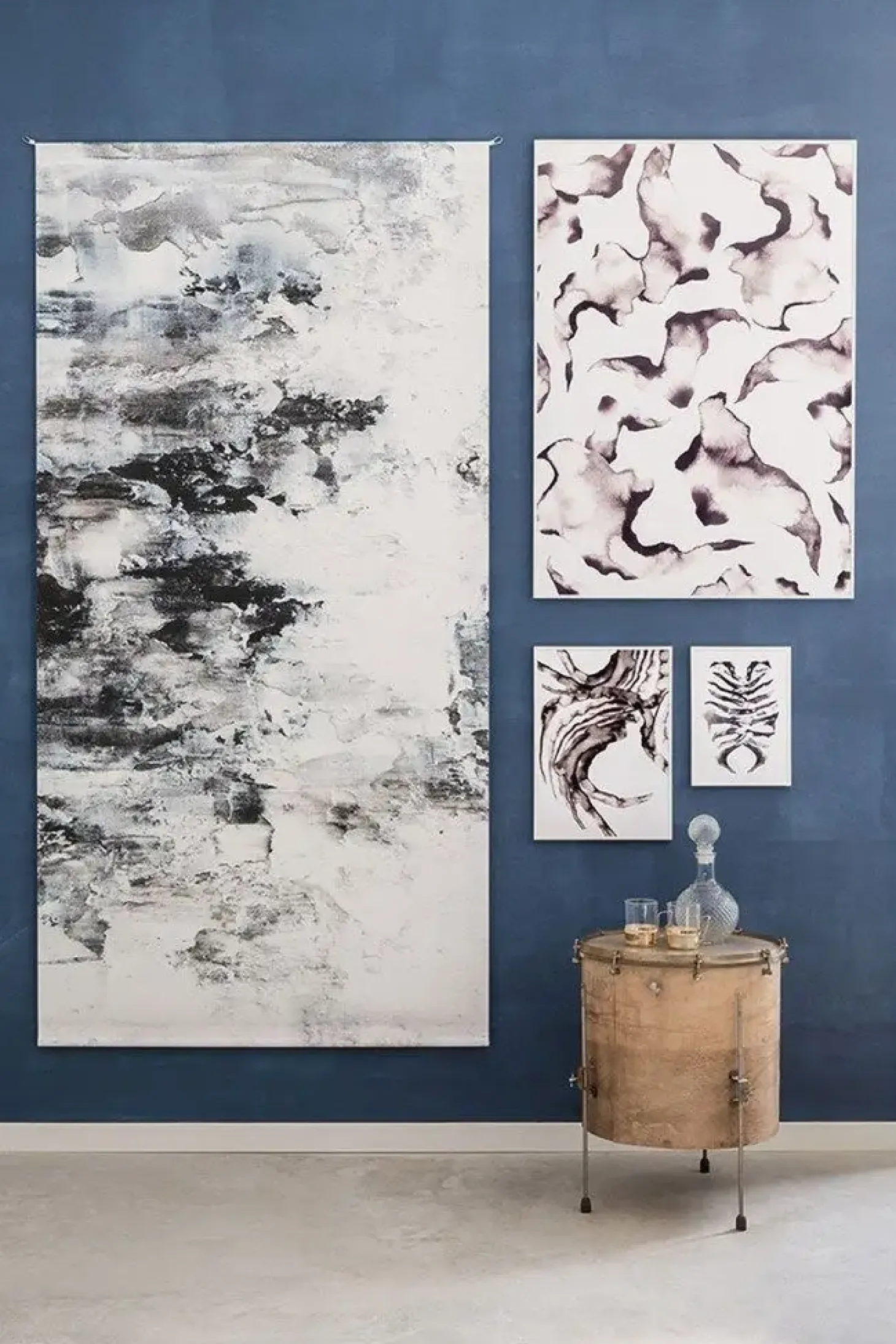 De lange penselstrøg og gennemsigtige former danner en monokrom helhed, som står i skarp kontrast til det underliggende hvide rum.