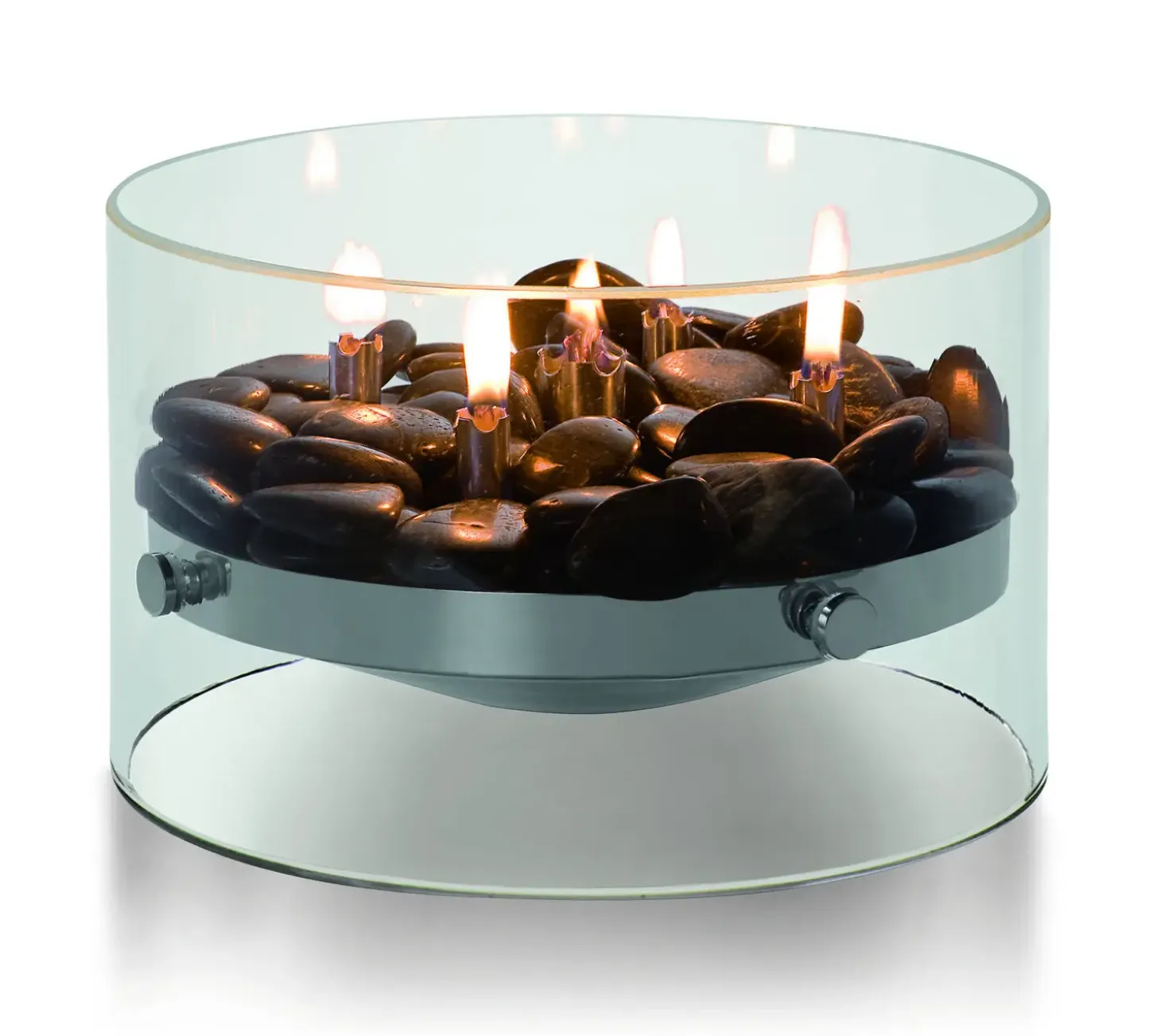 Fire olielampen er designet med fokus på både æstetik og funktionalitet. Den indeholder en metalstruktur og dekorative mørke sten, som bidrager til lampens visuelle appel.