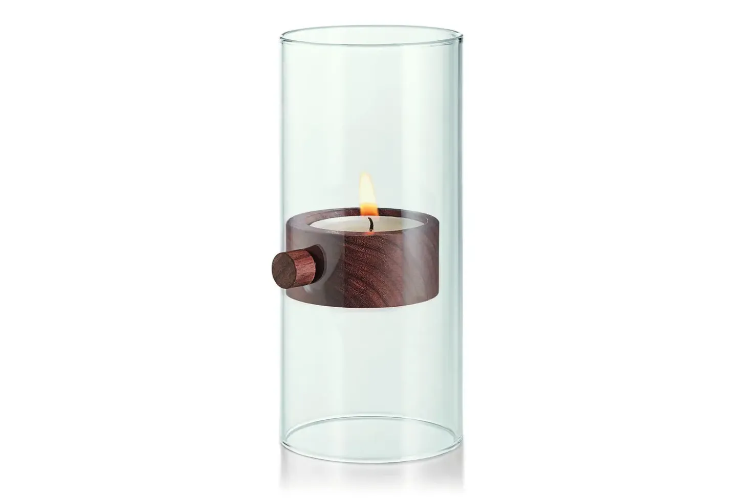 Lysholderen udmærker sig ved sin velovervejede konstruktion. Den magnetiske funktion bidrager til stabiliteten, mens valnøddetræelementet skaber en varm kontrast til det klare glas. Den cylindriske form giver mulighed for at se flammen fra alle vinkler, hvilket bidrager til en indbydende atmosfære.