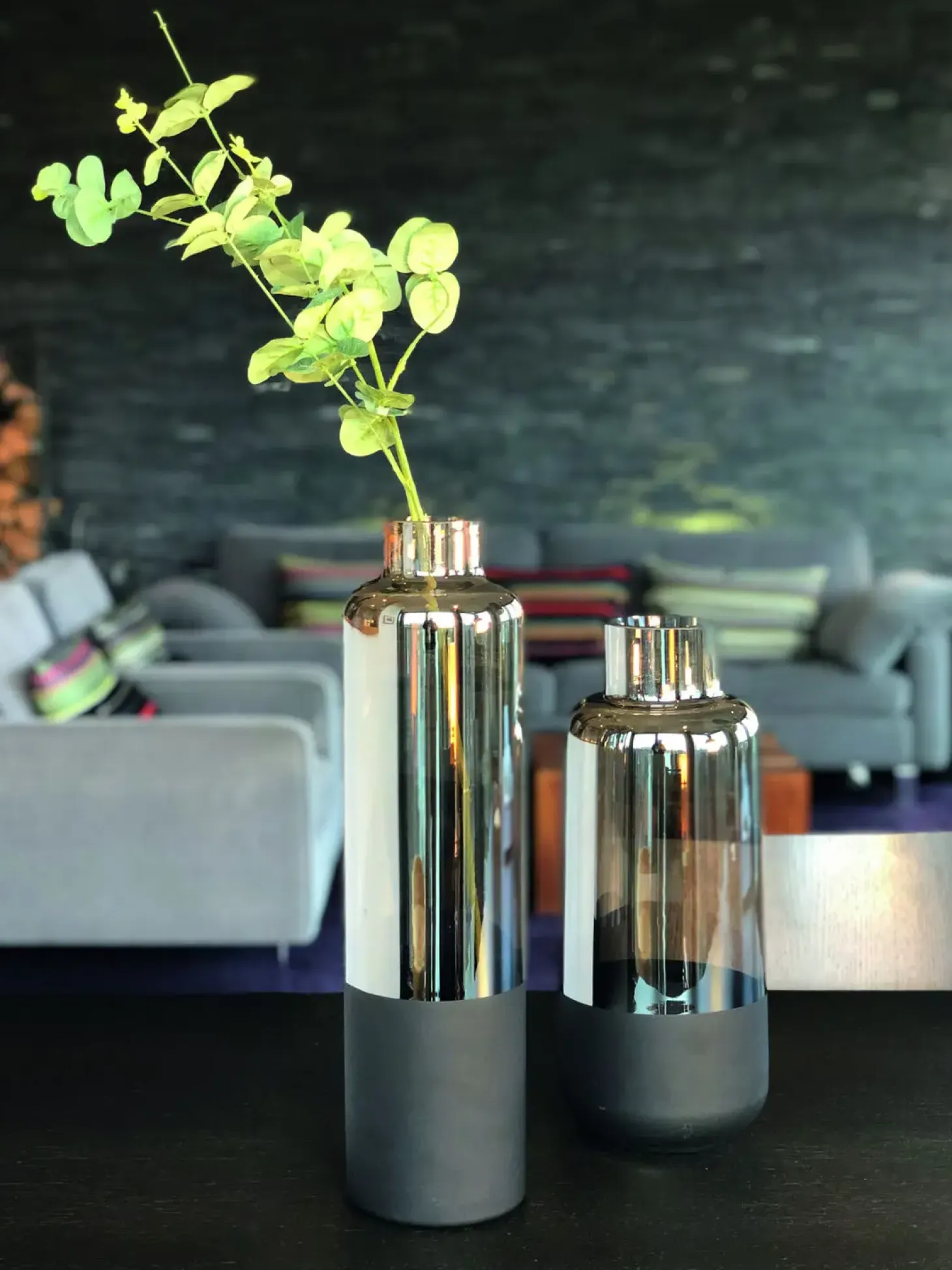 Philippi Linus vase, S kendetegnes ved sin nikkelbelagte og spejlblanke overflade, der reflekterer lys og omgivelser. Den cylindriske form med bredere base og smallere hals giver vasen en karakteristisk profil. Glasmaterialet bidrager til vasens overordnede udseende og kvalitetsfornemmelse.