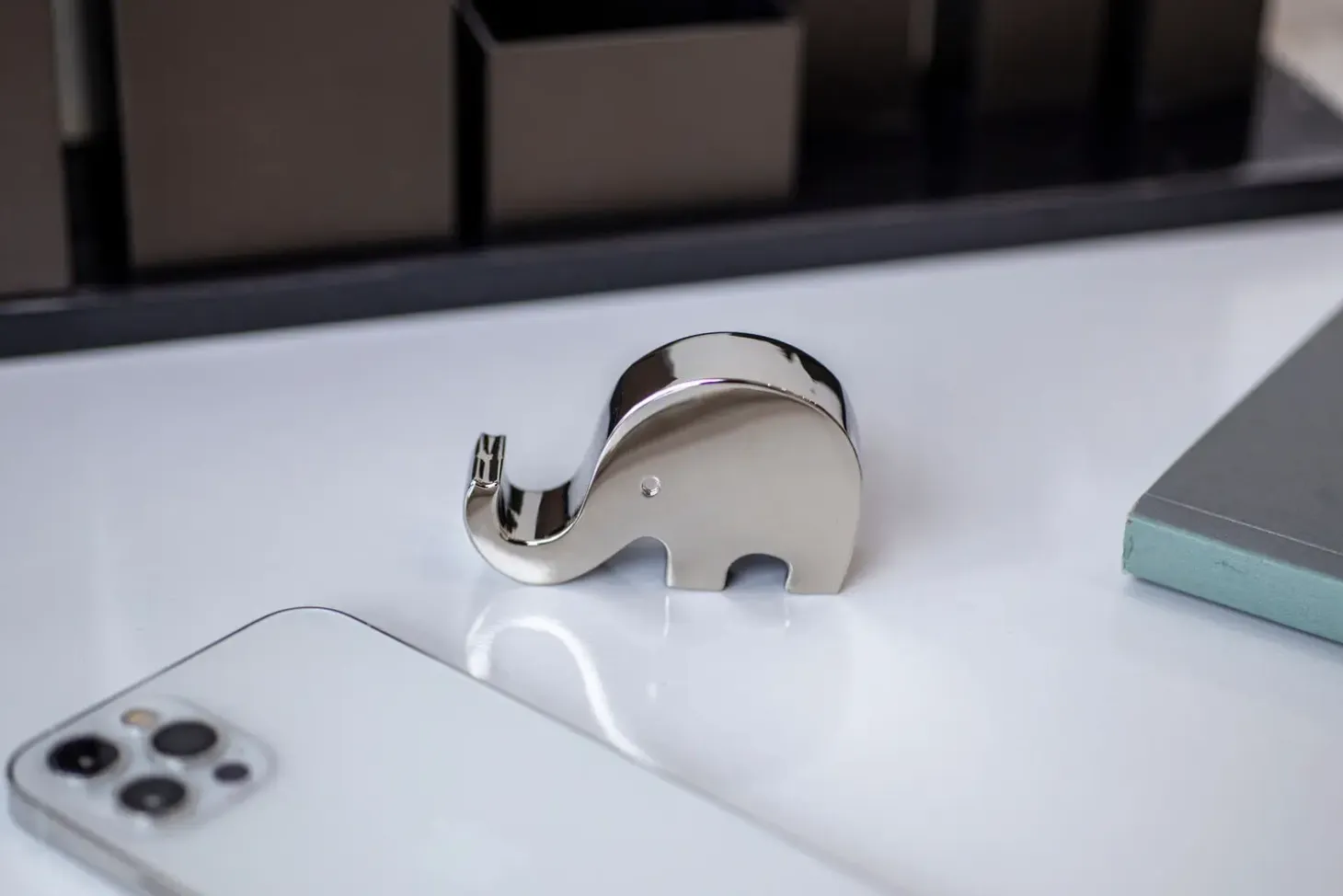 Philippi Tambo mobilholder kombinerer minimalistisk design med praktisk anvendelse. Den elefantformede holder i poleret nikkel tilbyder både en dekorativ og funktionel løsning til dit skrivebord eller hjem.