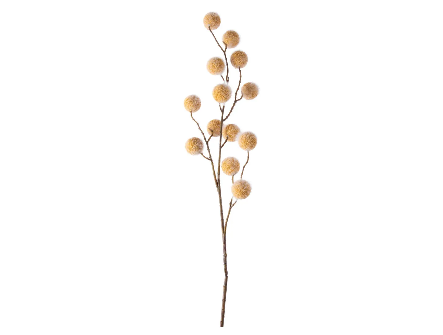 Stænglen har flere forgreninger med kugleformede elementer, der skaber en kunstnerisk og detaljeret profil. Polyethylenmaterialet sikrer, at farven holder, og at blomsten bevarer sin form over tid. Med disse mål kan du planlægge placeringen præcist, uanset om det er på dit skrivebord eller i entréen.