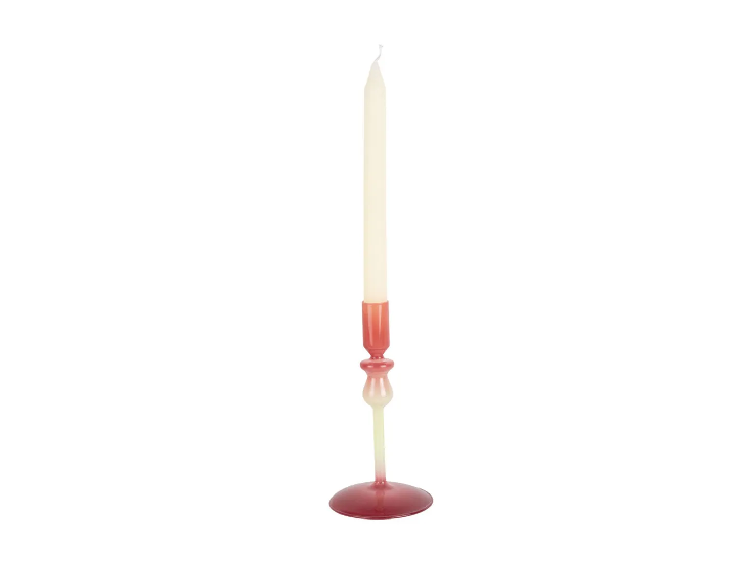 Denne lysestage fra Present Time har en farvegradient, der går fra varm lilla til blød grøn. Den er lavet af glas, som reflekterer lyset smukt og skaber en hyggelig atmosfære. Den runde base sikrer stabilitet, mens den slanke stammeform giver et moderne udtryk.