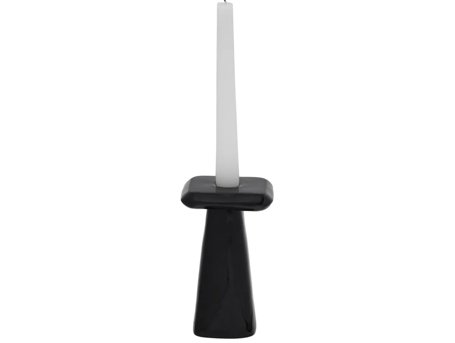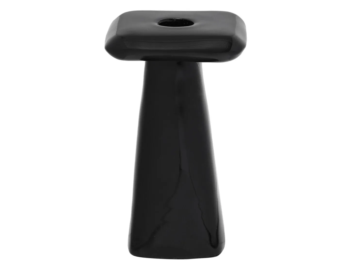 Den sorte farve gør lysestagen alsidig og i stand til at passe ind i forskellige indretningsstile. Jernmaterialet giver en robust konstruktion, der kan modstå daglig håndtering. Den glatte overflade og den minimalistiske form med firkantet top og tilspidset base skaber et moderne udtryk, der fungerer både alene og sammen med andre dekorationselementer.