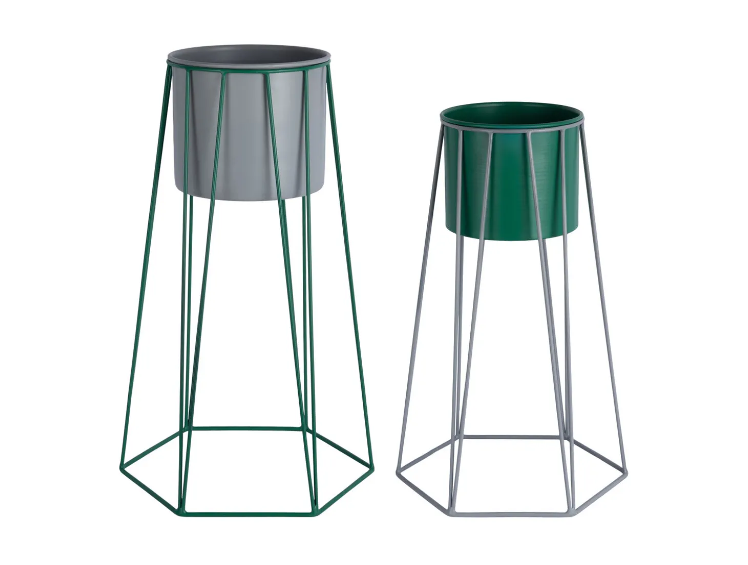 Farvekombinationen af grå og retrogrøn giver dig fleksibilitet i indretningen. Den geometriske wireframe-konstruktion skaber en moderne kontrast til planterne, mens jernets robusthed betyder, at du ikke behøver at bekymre dig om, at stativerne vipper eller bøjer sig. Sættet fungerer som en praktisk løsning, der også tilføjer karakter til dit rum.