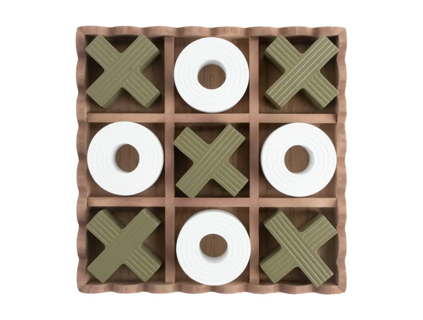 Dette Tic Tac Toe-spil kombinerer klassisk underholdning med moderne design. Spillebrikkerne har et unikt udtryk: armygrønne krydser og hvide cirkler med huller i midten, der gør spillet visuelt interessant. Pladen er lavet af MDF og måler 18,5 cm x 18,5 cm, hvilket gør den nem at placere på sofabordet eller reolen.