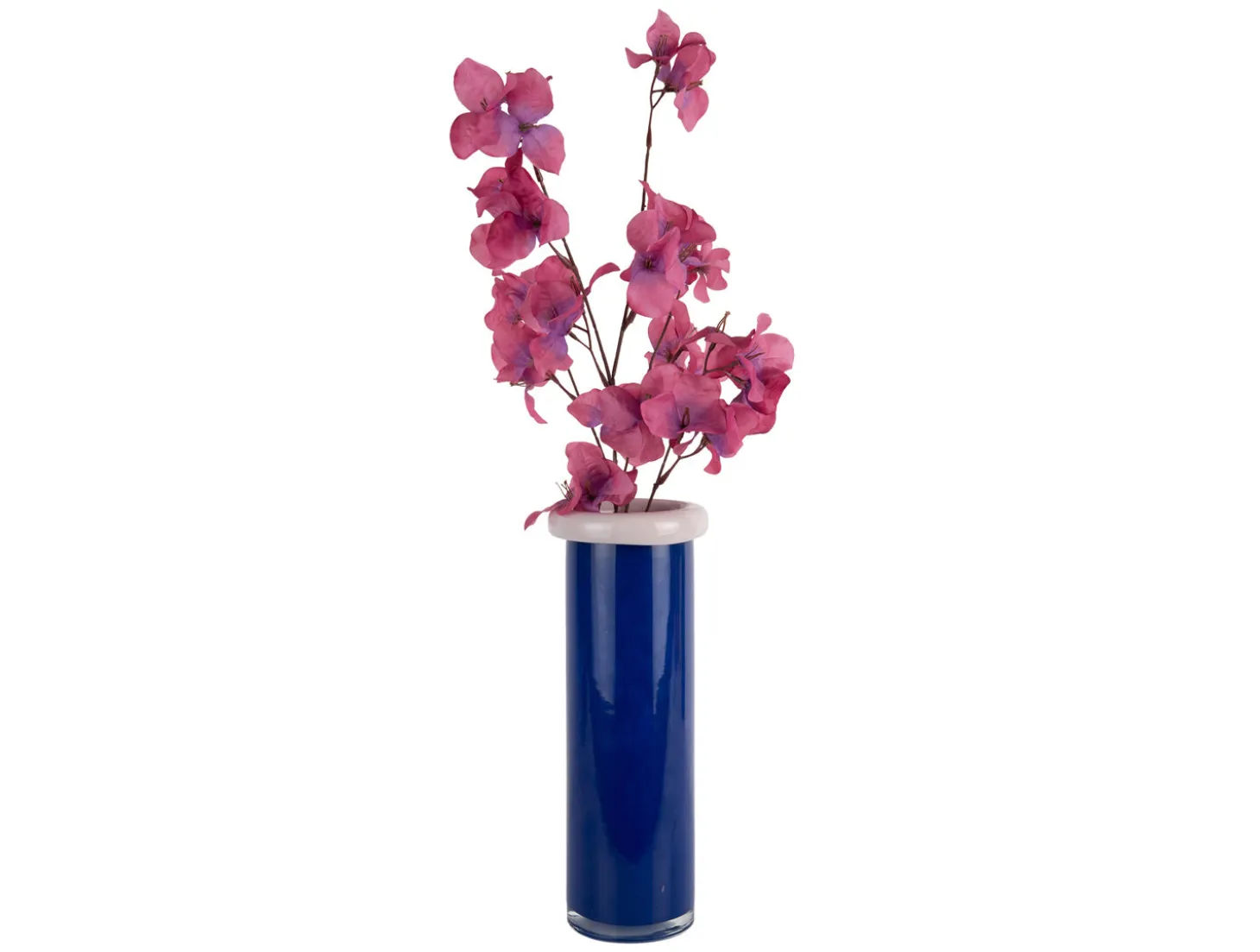 Denne vase kombinerer en dyb koboltblå krop med en blød lyserød kant øverst, hvilket skaber en kunstnerisk kontrast, der tiltrækker opmærksomhed. Glasmaterialet giver en klassisk finish, der passer til mange indretningsstile, mens den gennemsigtige struktur fremhæver blomsterne indeni.