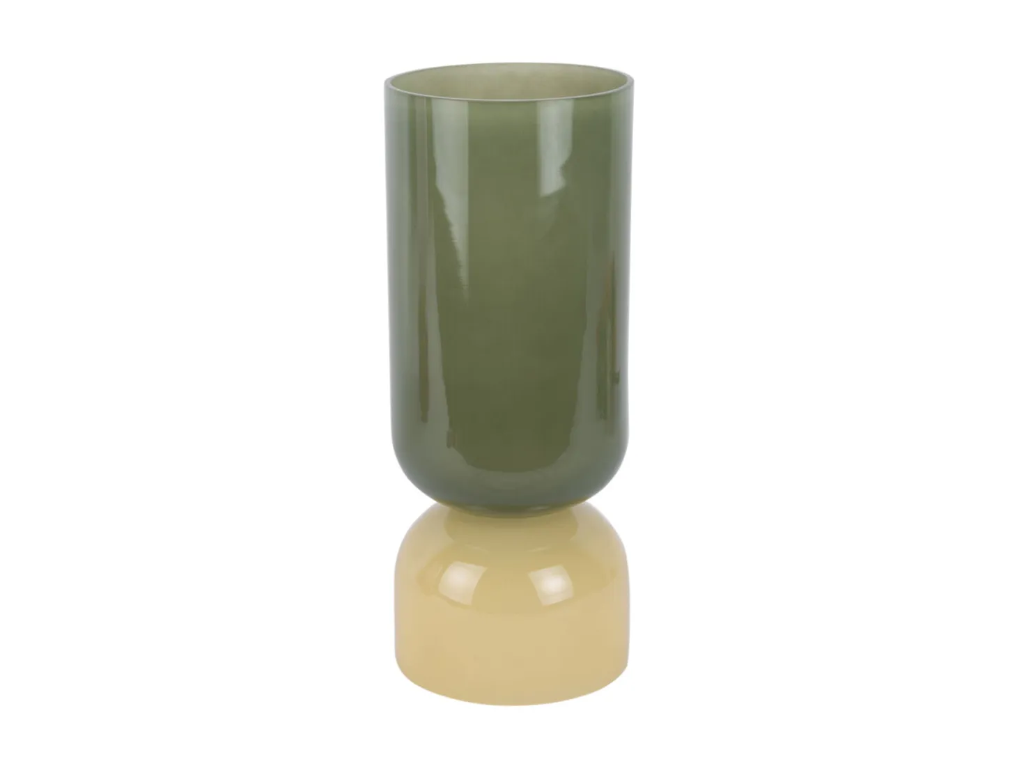 Denne vase fra Present Time kombinerer junglegrøn og blød gul i et todelt design, der bringer naturens farver ind i dit hjem. Vasen er lavet af glas, hvilket giver en klar gennemsigtighed, der fremhæver dine blomsterarrangementer. Med en højde på 37 cm og en diameter på 15 cm passer den til både større buketter og enkle grene.