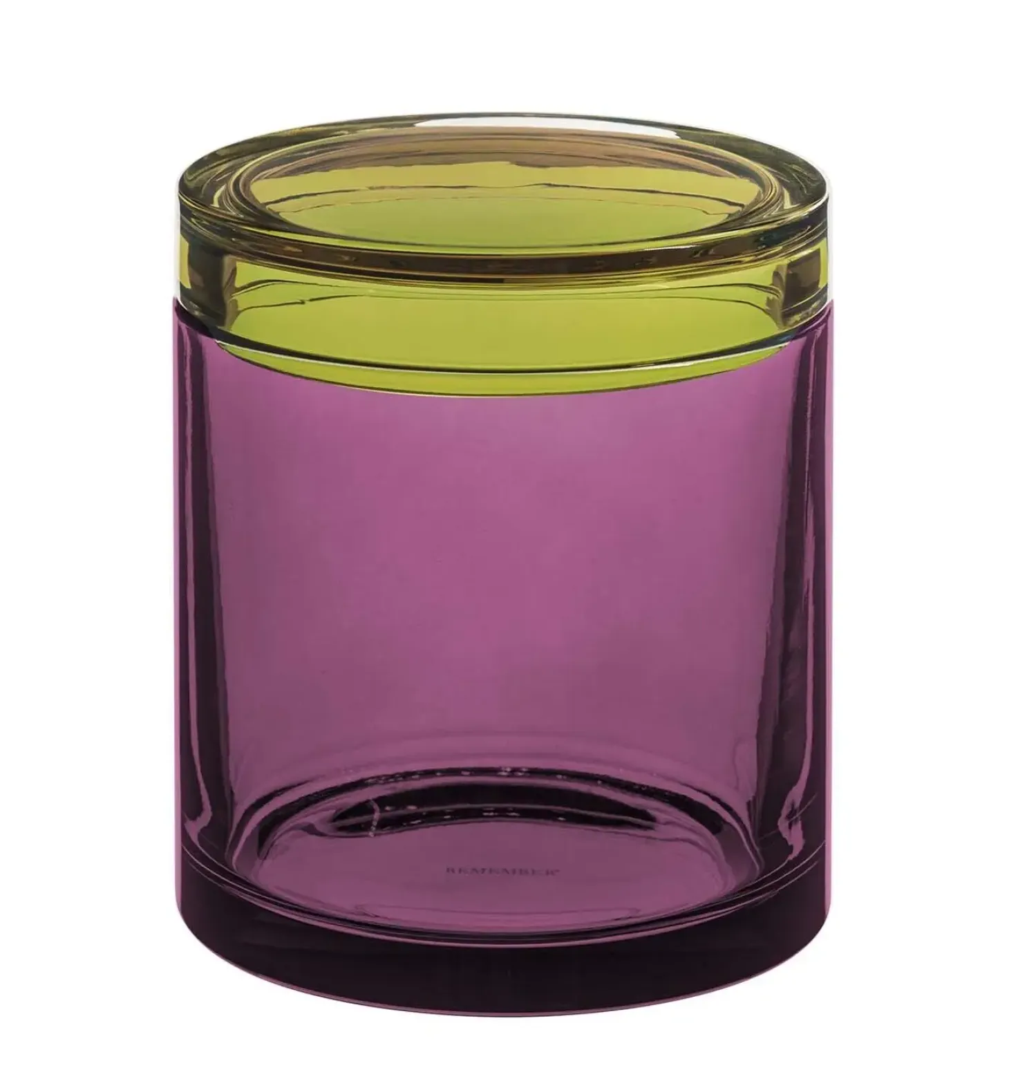 Denne cylindriske glaskrukke med låg, kaldet Glaskrukke – Medium, kombinerer farve og funktionalitet i dit hjem. Med sin lilla krop og grønne låg skaber den en iøjnefaldende kontrast, der passer perfekt ind i et kreativt og stilbevidst hjem. Den cylindriske form og det farverige design gør den til et unikt indretningselement.