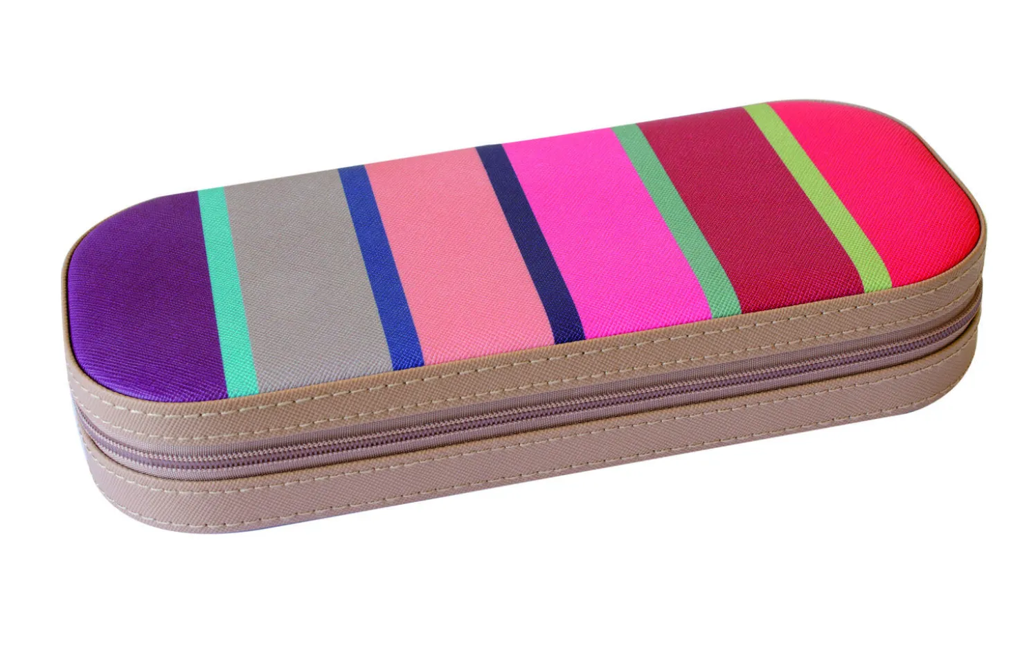 Nova smykkeskrin Nova bringer liv og orden til din smykkesamling med sit iøjnefaldende stribede design og praktiske funktioner. Dette skrin er perfekt til både hverdagsbrug og rejser, takket være dets kompakte størrelse og lette materiale. Det farverige design på låget tilføjer et friskt og moderne touch til din smykkeopbevaring, mens den høje kvalitet af det imiterede læder sikrer holdbarhed og et luksuriøst udseende.