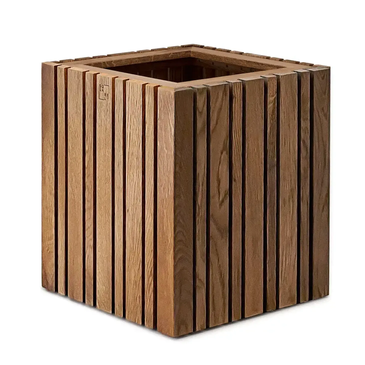 Plantekasse i mørk eg med vertikale lameller til professionelle miljøer. 4,5 L selvvandingsbeholder giver planterne vand i flere dage.
