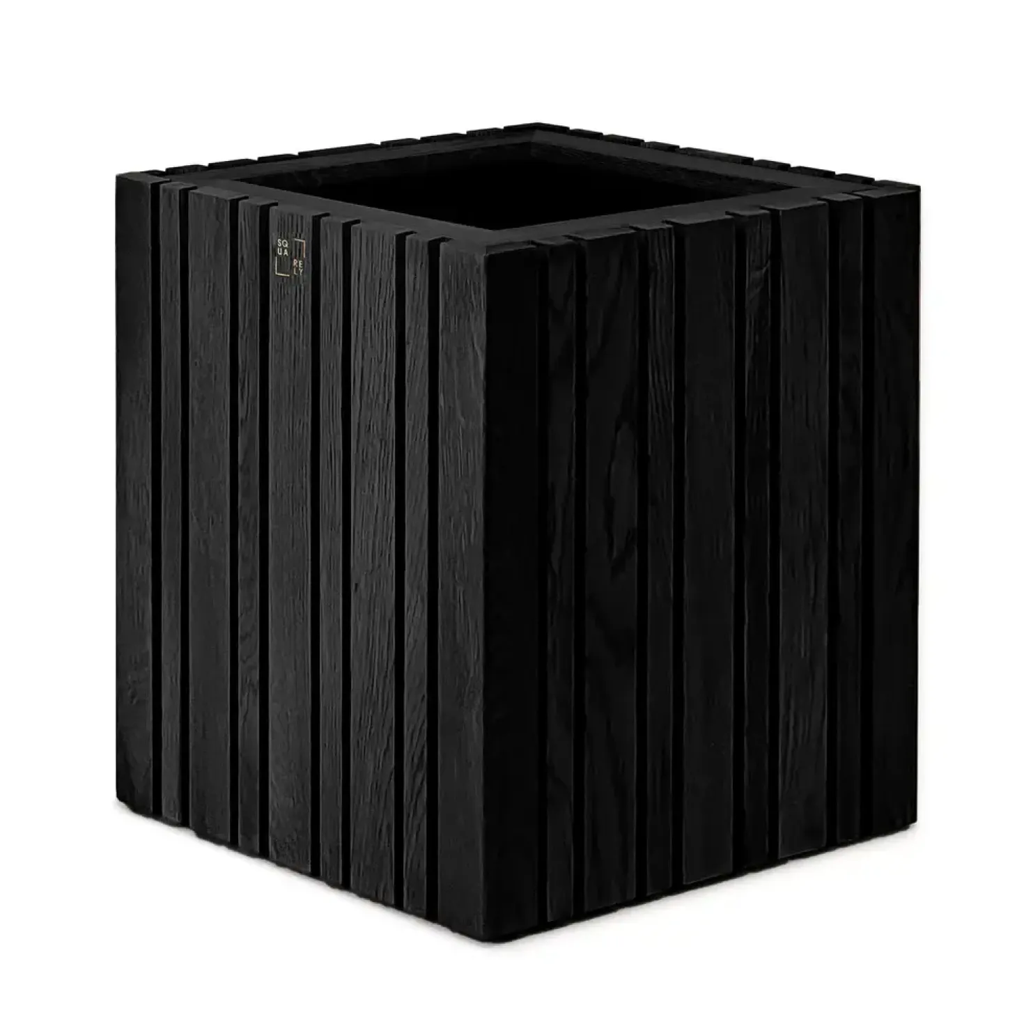 Håndlavet plantekasse i sort ask med vertikale lameller. GrowMORE har et selvvandingssystem på 4,5 L, der sikrer dine planter effektiv vanding i flere dage. Designet passer til både indendørs og udendørs brug.