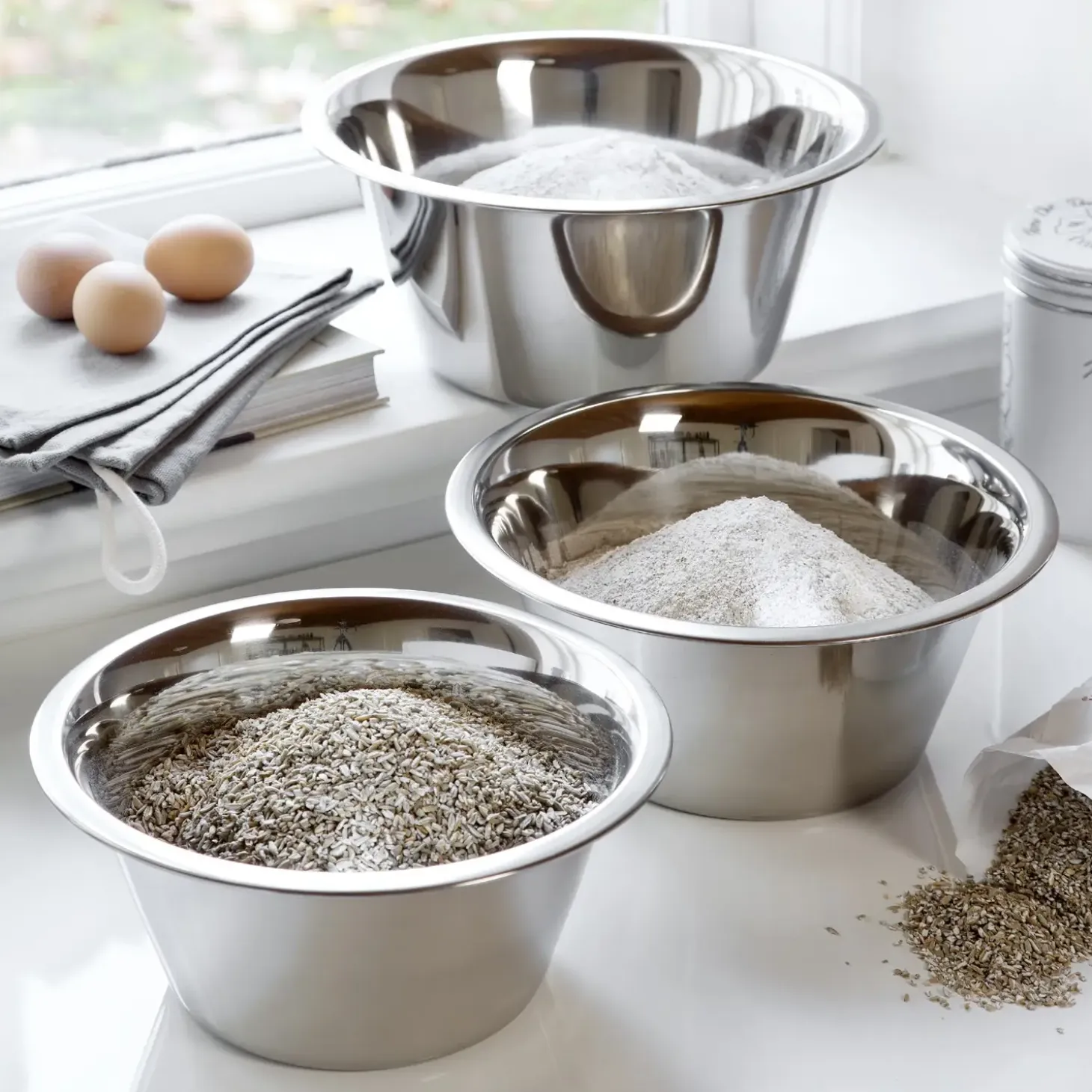 Med dette skålesæt får du tre skåle i rustfrit stål i forskellige størrelser. Den største skål rummer 4,2 liter – rigelig plads til dine større portioner og bageblandinger. Skålene er fremstillet i holdbart rustfrit stål.