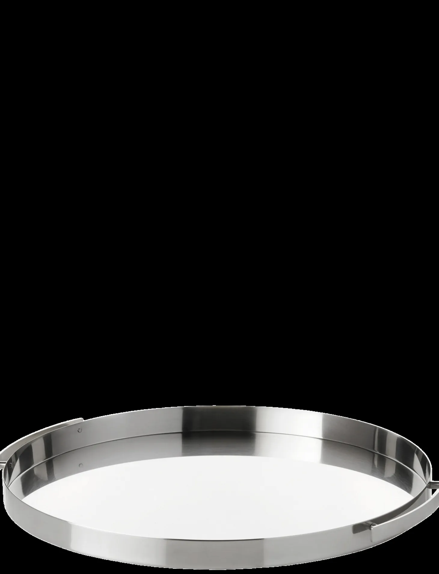 Arne Jacobsens serveringsbakke i rustfrit stål har et funktionelt greb, som følger den cylindriske form, og gør det let at løfte bakken fra bordet. Serveringsbakken står smukt med de resterende dele af Arne Jacobsens barsæt eller kaffekanden og tekanden fra Cylinda-line designfamilien. Bakken er af rustfrit stål og den har en diameter på 33,5 cm.