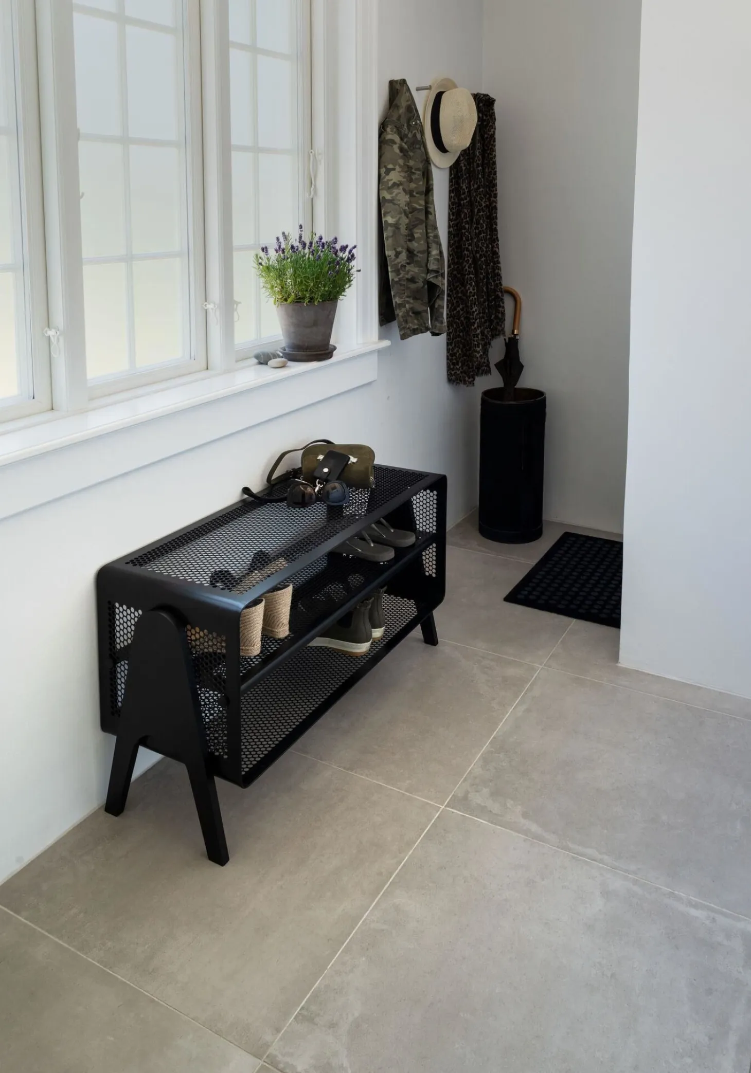 Tica Copenhagens store gulvreol er en multifunktionel reol/møbel i perforeret metal, som egentlig er designet til sko, men kan bruges til en lang række andre ting og sager. Hylden kan let flyttes, så du kan optimere pladsen på reolen.