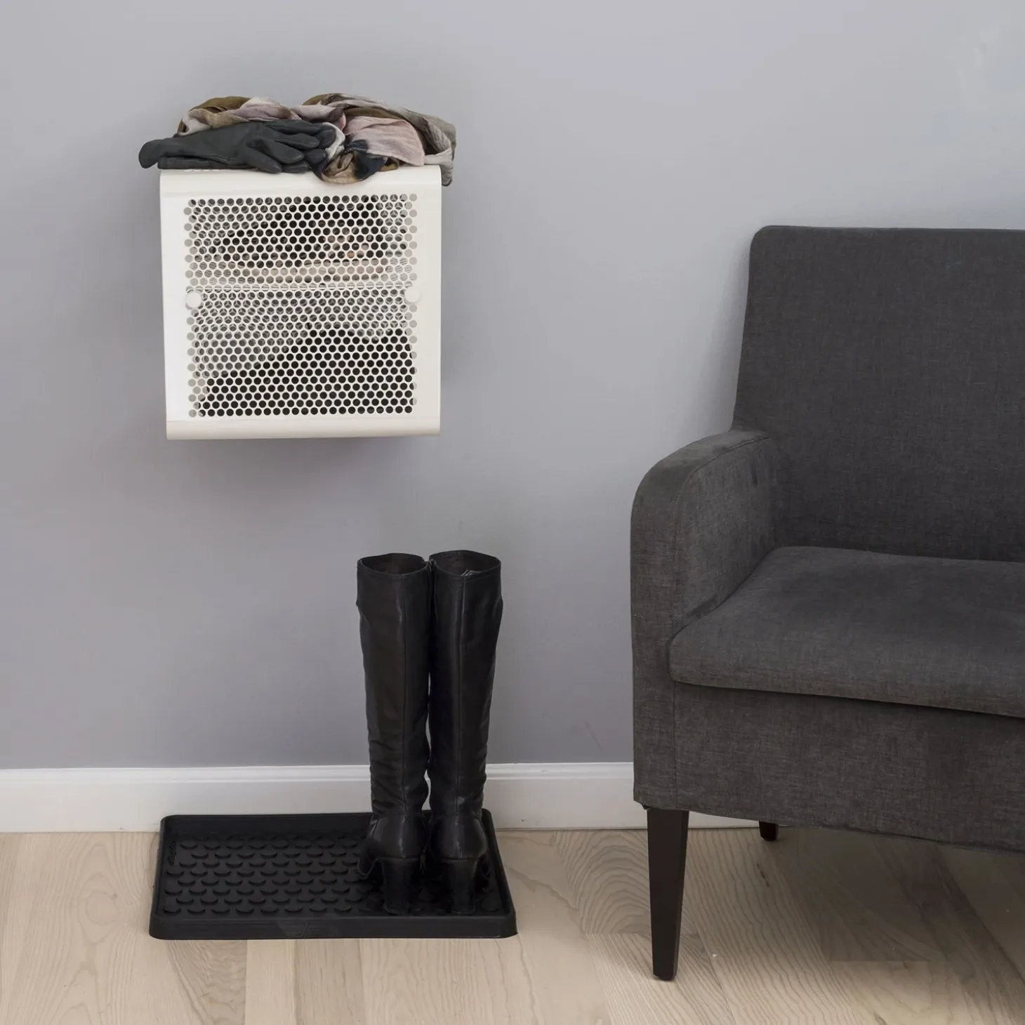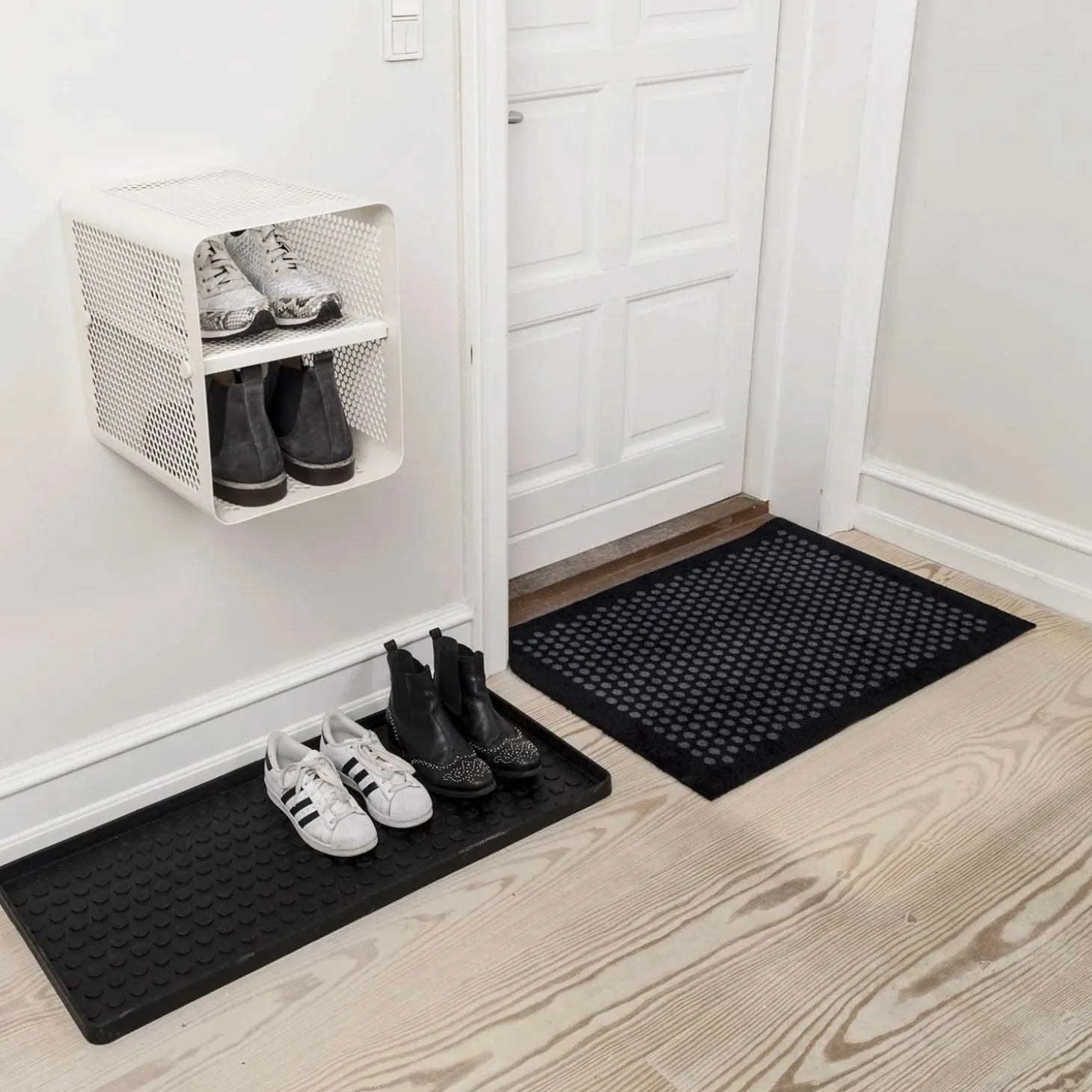 Skoreolen passer perfekt til entreen, men kan også bruges i soveværelset eller garderoben. Siderne på reolen kan bruges til nøgler, cykelhjelm eller andet, da der kan hænge s-kroge. Reolen kan hænges på to måder – enten med hylderne mod front eller med reolen parallelt med væggen. Reolen er inklusiv 1 flytbar hylder.