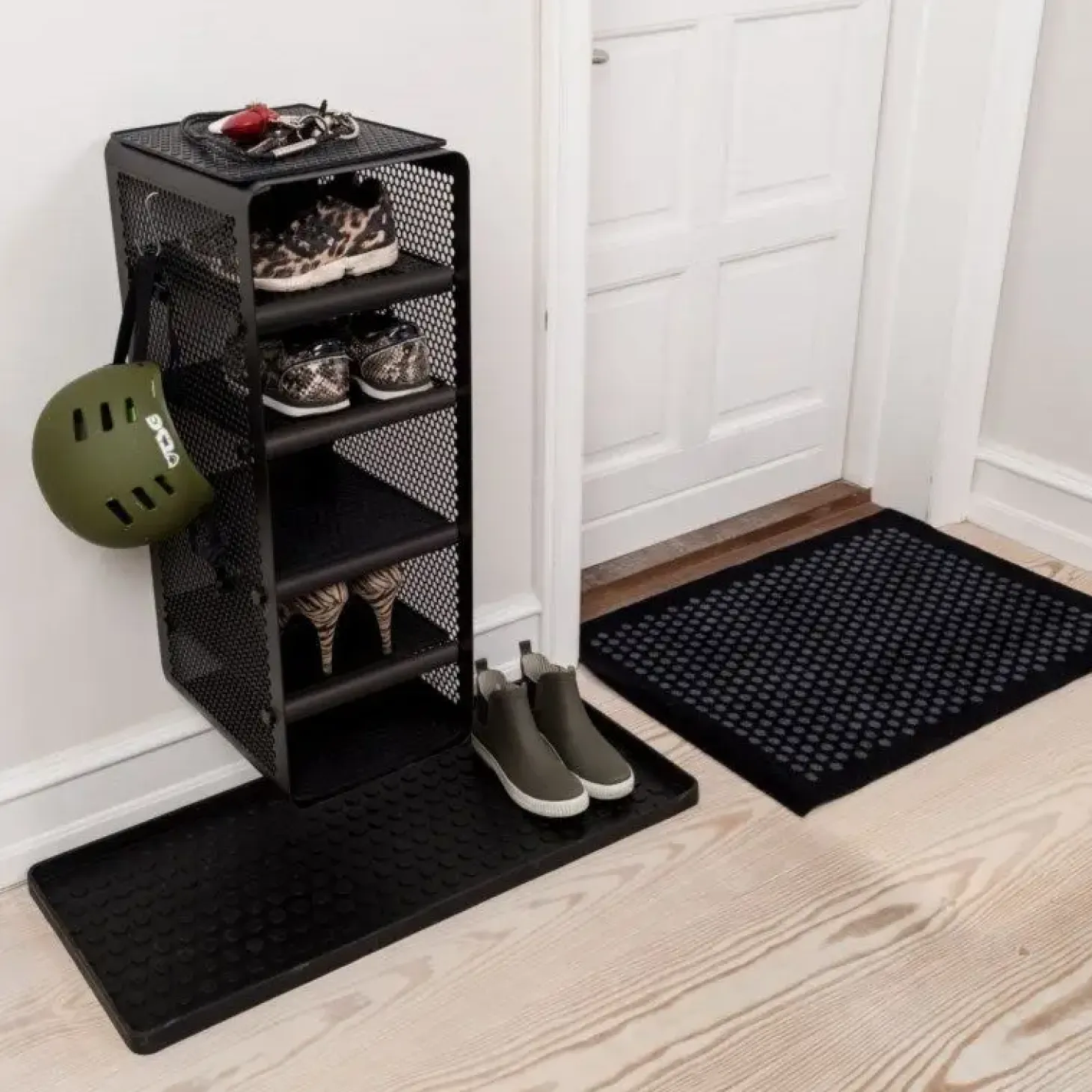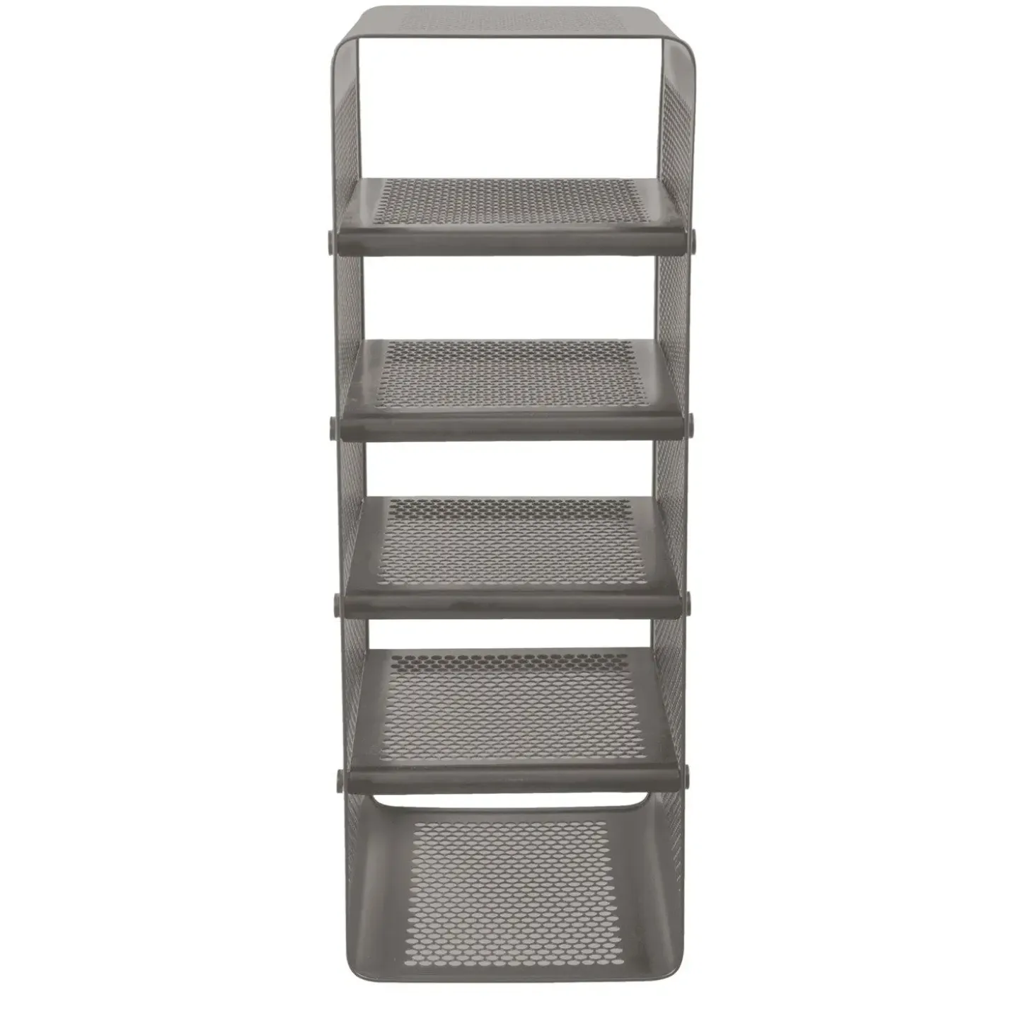 Den smarte vægreol i mat grå fra Tica Copenhagen er lavet i perforeret metal med et fint hulmønster. Det hullede mønster i siderne og formen på reolen står i fin kontrast til metallet, så helheden bliver harmonisk. Reolen er super fin som skoreol i entreen og kan også bruges i garderoben.