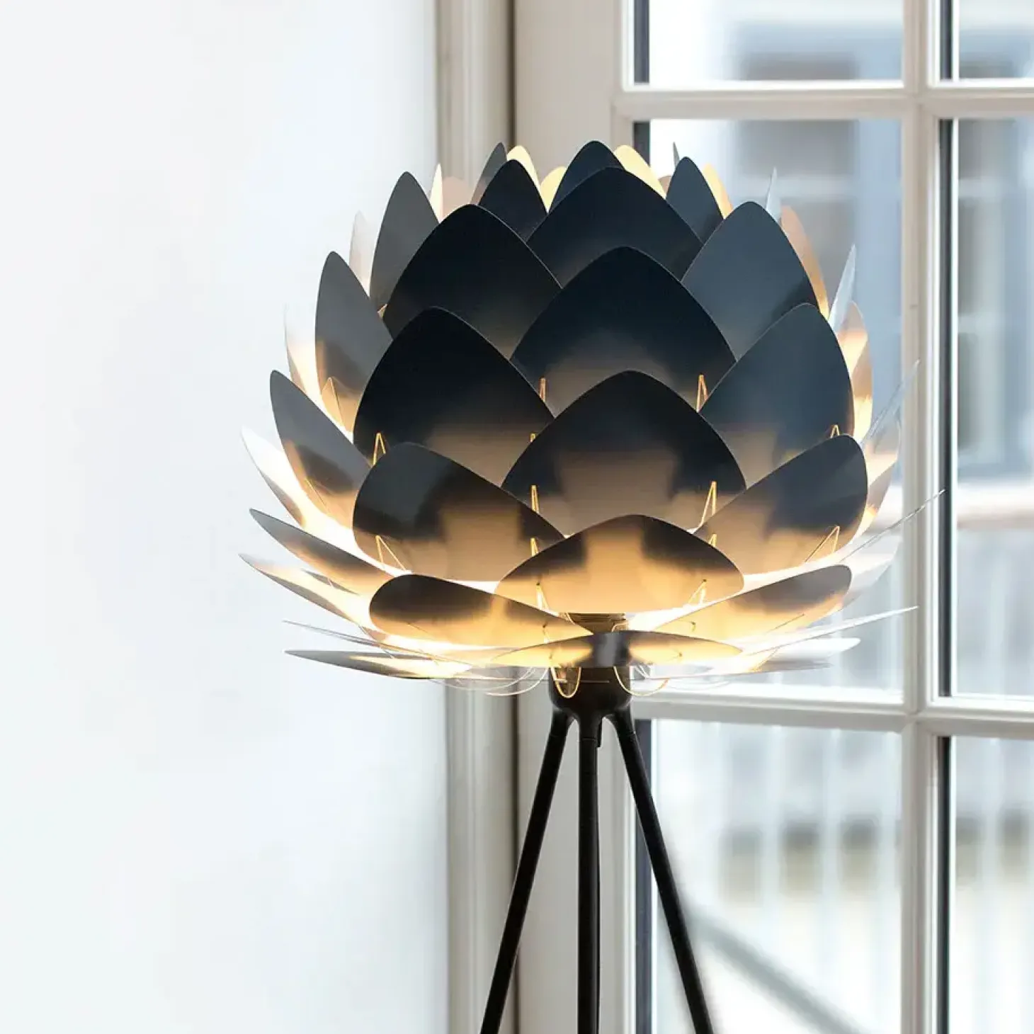 Den smukke kogle-formede Aluvia mini lampeskærm i antracit grå fra Umage er lavet med blade af aluminium, som giver lampen et let og robust udtryk på samme tid. Lampeskærmen giver dig mange muligheder i din indretning. Hæng fx lampen over dit spisebord eller i entreen – husk at tilkøbe . Eller brug den som gulvlampe med en eller som bordlampe med en .