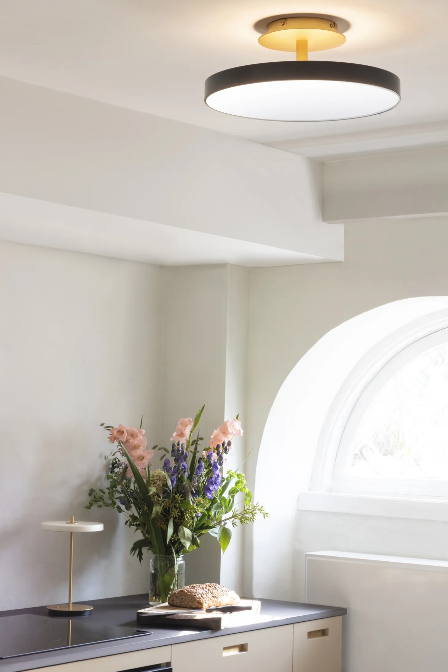 Med den flotte Asteria Up loftlampe får du det perfekte lys i køkkenet eller entreen i en stilren og diskret løsning. Lampeskærmen er placeret på en messingbase, som er med til at give loftlampen et raffineret udtryk. Toppanelet skaber et omgivende lys opad, der sikrer en blød atmosfære i rummet.