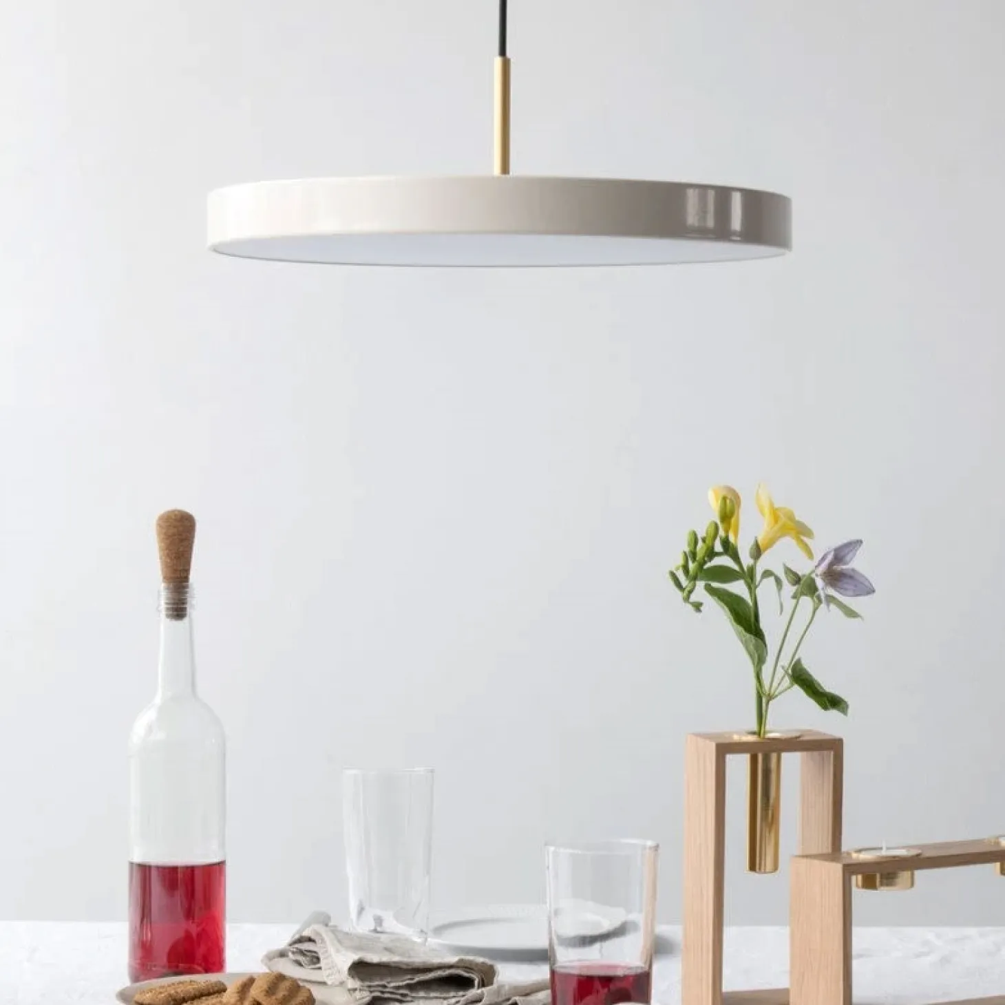 Materiale: Stål (messingbelagt og pulverlakeret), aluminium, PMMA og metalbaldakin. Indbygget LED-panel