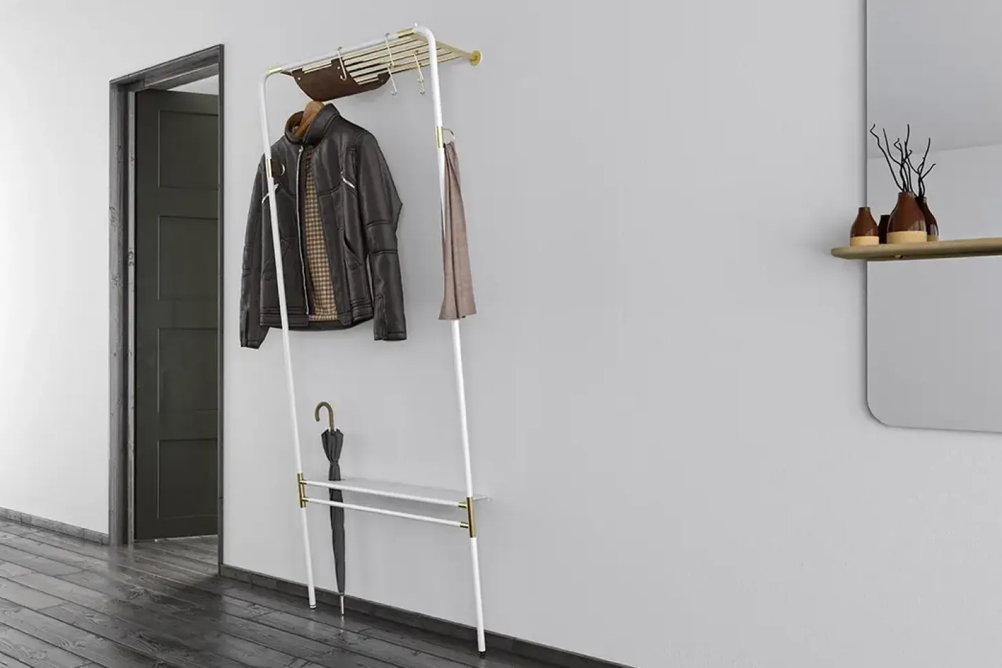 Materiale: Stål (pulverlakeret/forgyldt messing), kunstlæder (dark brown)