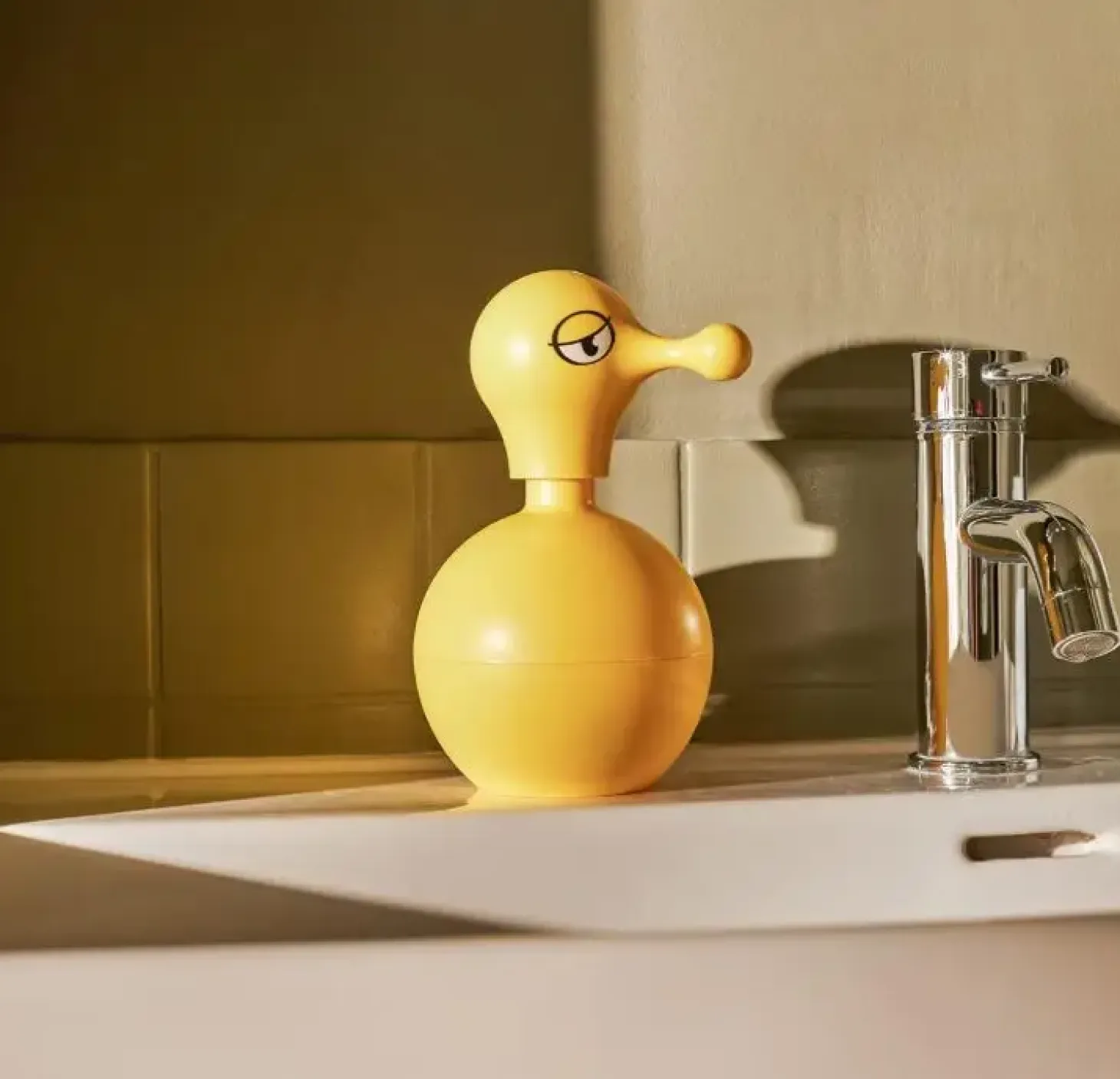 Med sine velovervejede mål passer dispenseren naturligt ind på badeværelseshylden eller ved håndvasken. Den gule farve og det sjove design tilfører et legende element til rummet, mens den praktiske funktion gør den til en pålidelig følgesvend i hverdagen.