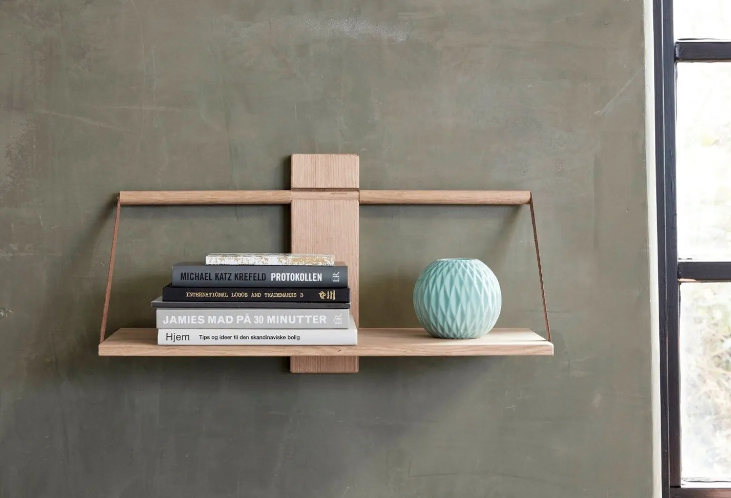 Andersen Furniture har lavet denne flotte egetræshylde med læderstropper. Hylden har et minimalistisk og let udtryk, der passer ind de fleste steder. Hylden er tilmed let at hænge op på væggen og det er også muligt at hænge flere hylder over hinanden, således det kommer til at ligne en reol.