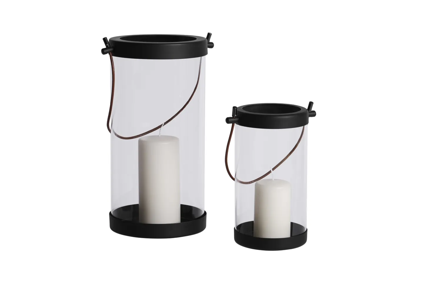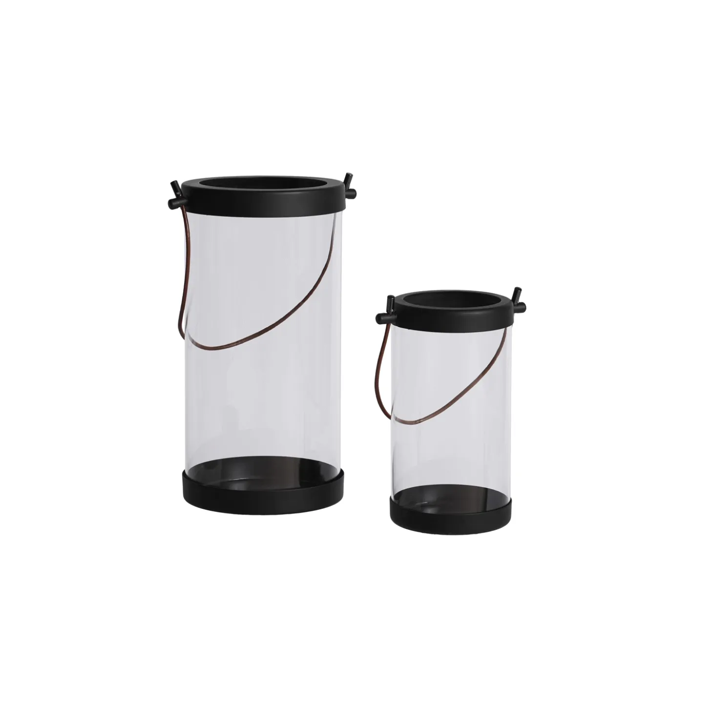 Sættet består af to lanterner i forskellige størrelser, hvilket giver mulighed for varieret placering og brug. Den mindre lanterne måler Ø14 x H20 cm, hvilket gør den egnet til mindre rum eller som accent på en bogreol. Den større lanterne, Ø20 x H30 cm, kan fungere som et centralt element på et spisebord eller i en vindueskarm. Begge lanterner er fremstillet af en kombination af klart glas og pulverlakeret metal, hvilket giver dem et moderne udseende og gør dem særdeles holdbare. Håndtaget af lædersnor tilføjer et praktisk element og gør det nemt at flytte lanternerne efter behov.