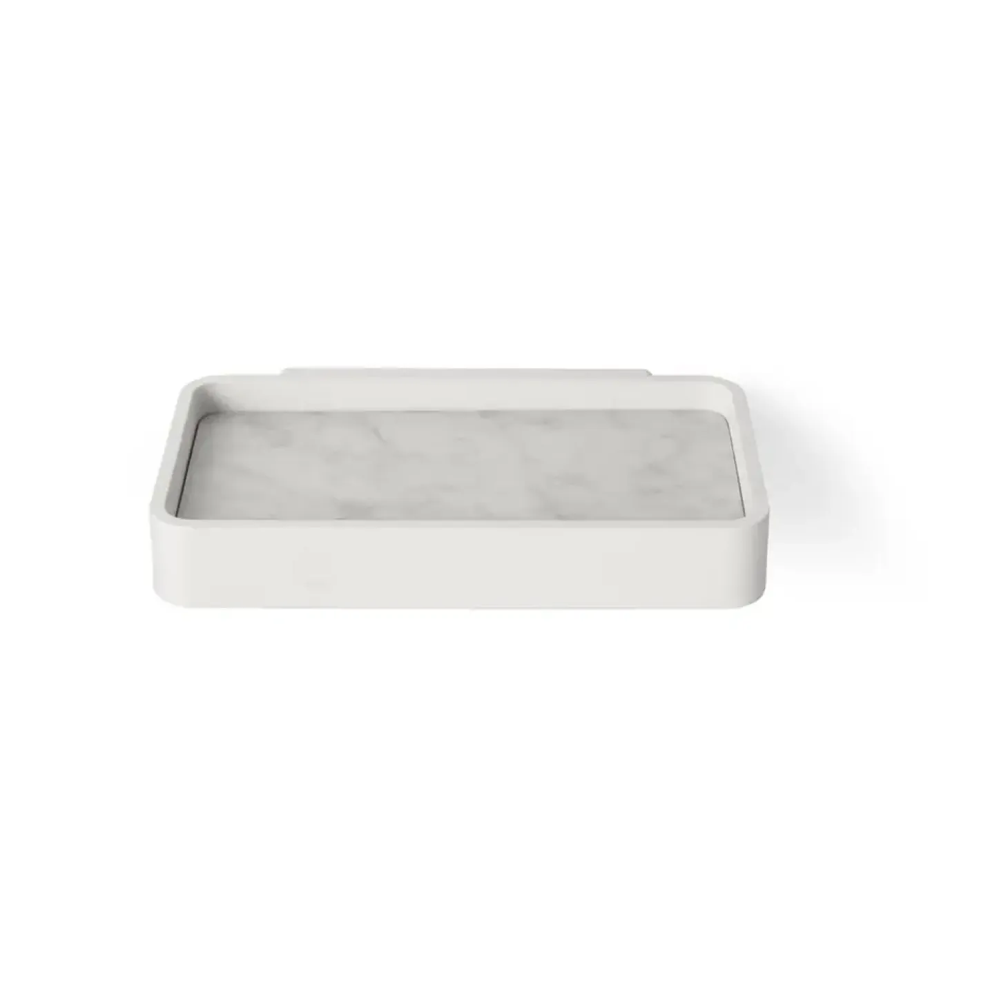 Den hvide nuance med marmoreret mønster og afrundede kanter skaber et elegant og moderne udtryk. Denne æstetik gør bakken velegnet til badeværelser, der værdsætter enkelhed og elegance.