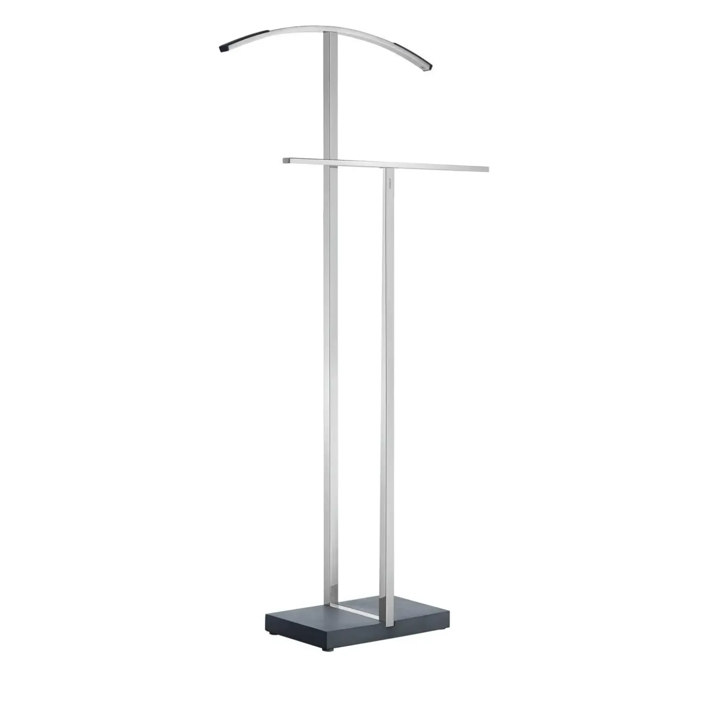 En klassiker med en moderne fortolkning. Designet passer til enhver moderne interiørstil. MENOTO kammertjenerstanden giver et hurtigt, foldningsfrit sted at hænge dit slidte tøj op. Det robuste design og den kunstige stenbund gør tøjstativet meget stabilt. Det matte, kubiske rustfri stålrør går lige gennem polyStone-basen – en særlig elegant detalje.