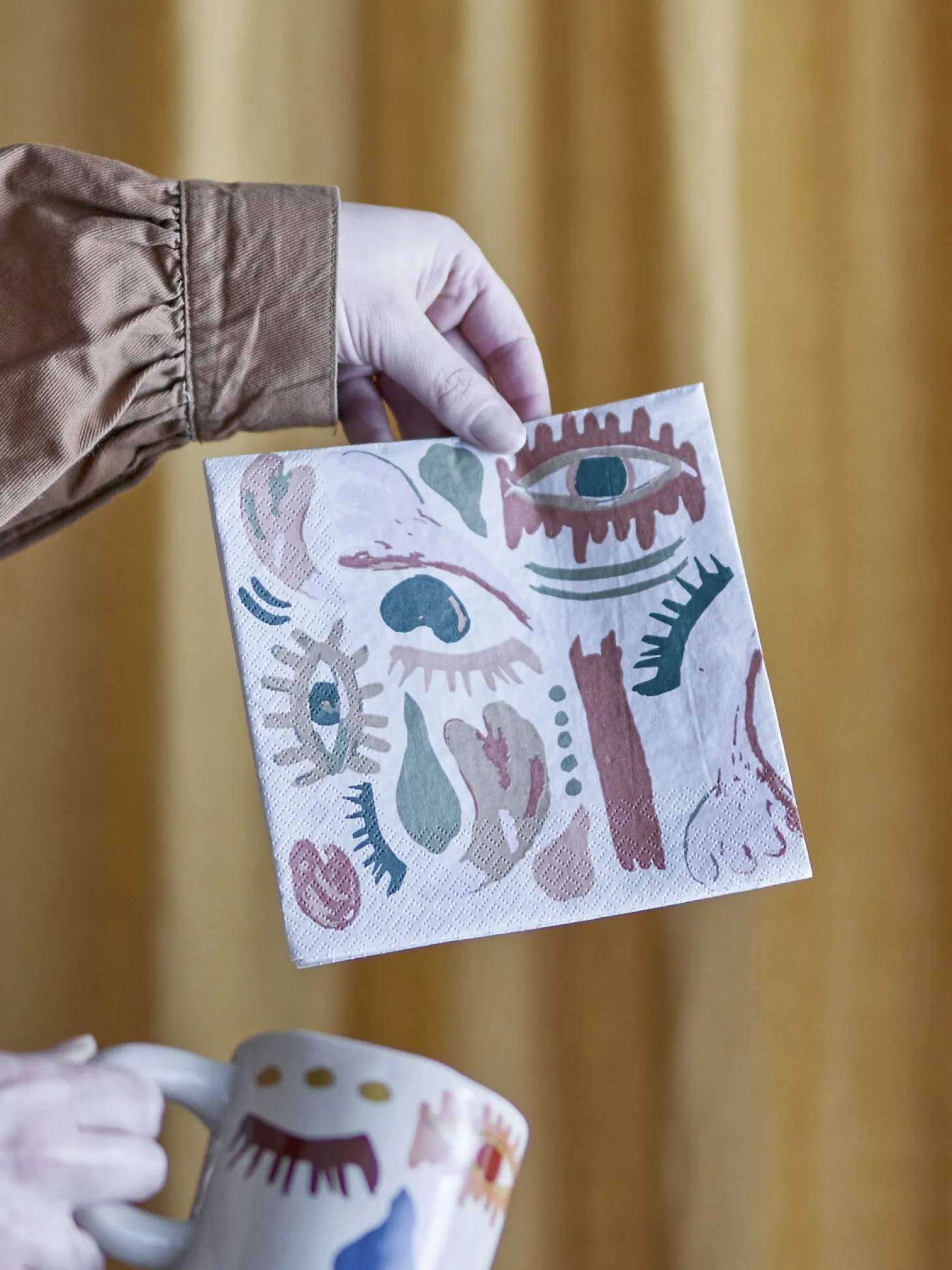 Det kvadratiske format på 33 x 33 cm gør servietterne ideelle til både hverdag og fest. Det karakteristiske design med abstrakte former og øjne skaber et interessant udtryk, der nemt kan integreres i forskellige borddækninger.