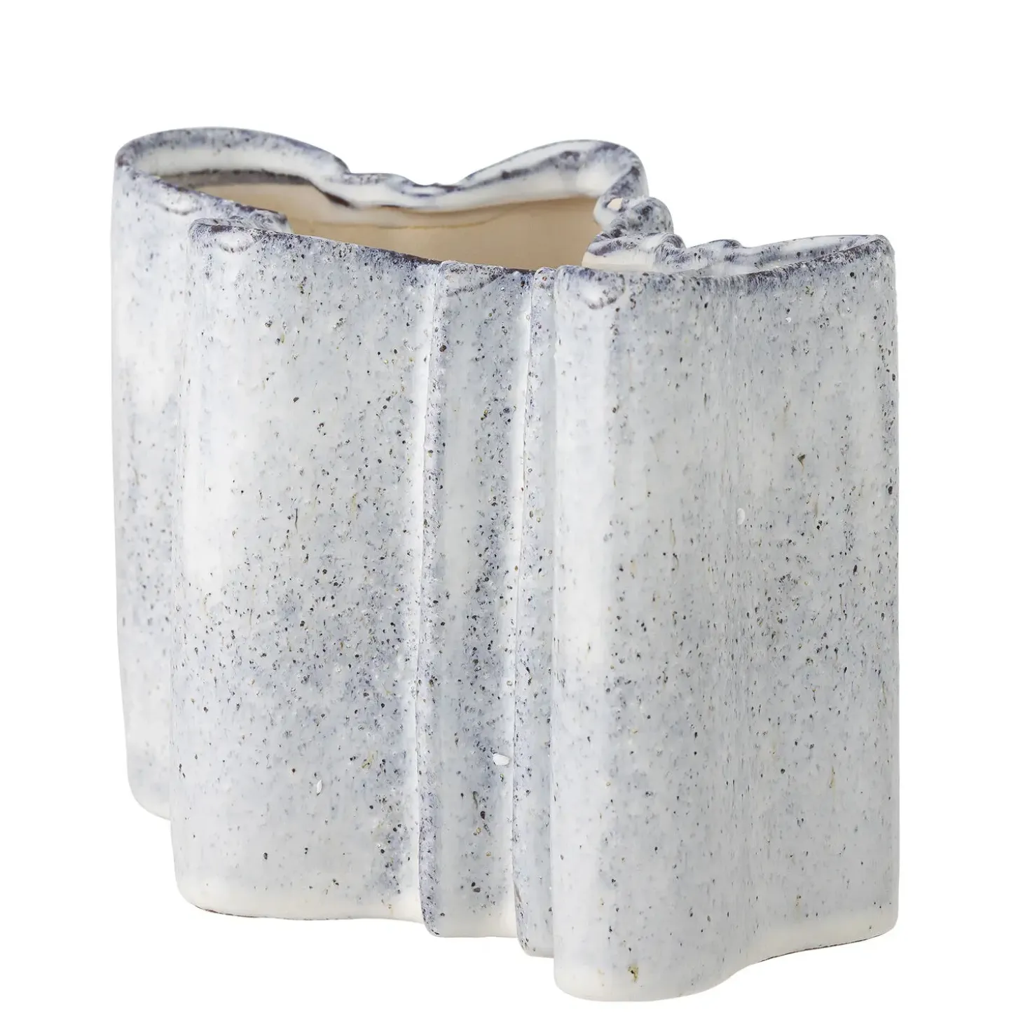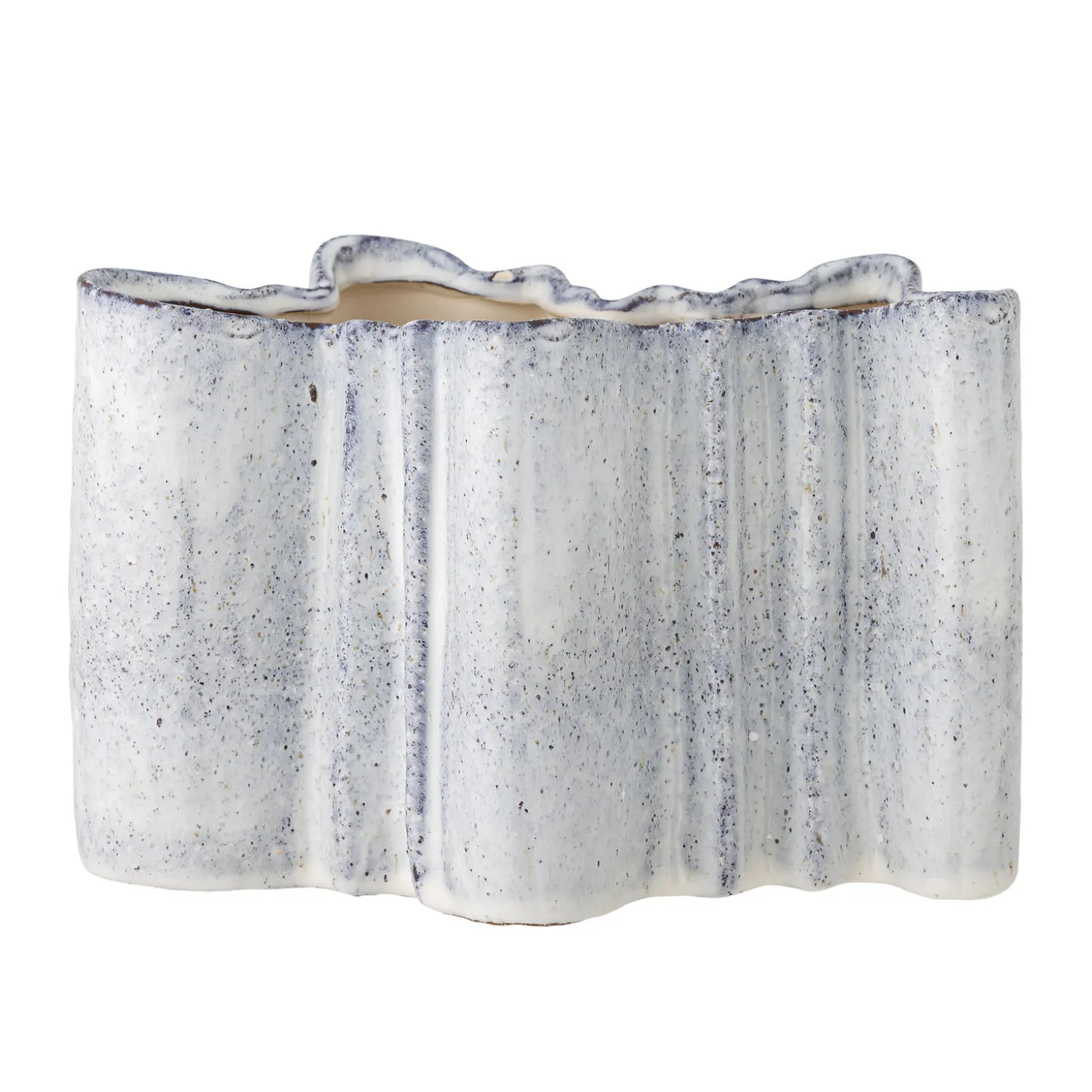Denne håndlavede stentøjsvase fra Bloomingville byder på unikke farvevariationer takket være den reaktive glasur. Den bølgende form og det spættede mønster i blågrå nuancer gør hver vase til et særligt stykke håndværk.
