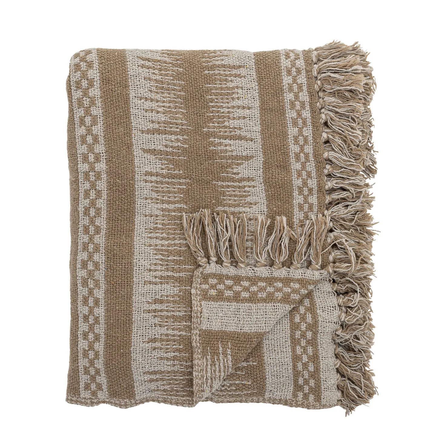 Den vævede tekstur giver plaidet et roligt og tidløst udtryk. Frynser langs kanterne tilføjer et håndværkspræget element, mens de brune og cremefarvede striber skaber en neutral base, der passer ind i mange indretningsstile.