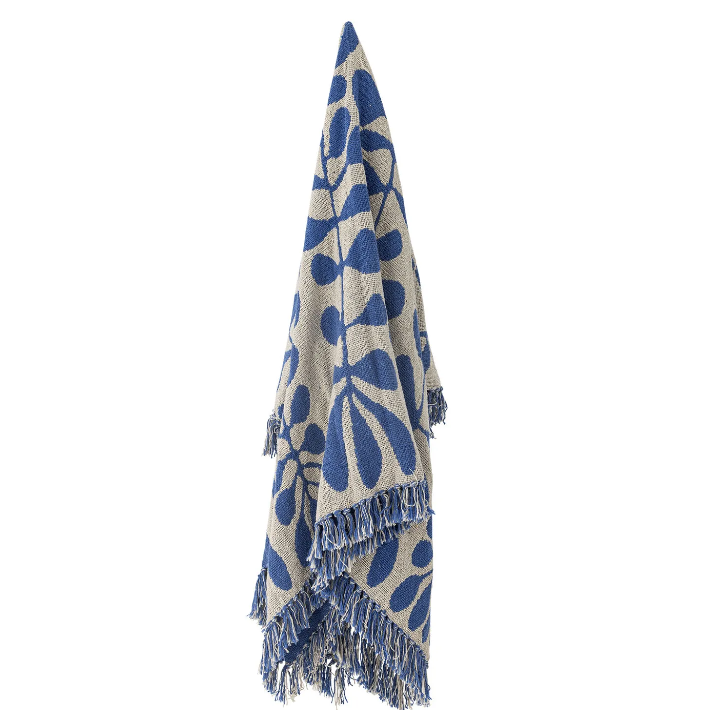 Denne dobbeltvævede plaid fra Bloomingville har et blomster- og bladmønster i blå nuancer på en lys baggrund. Plaiden har frynser på alle fire sider og er fremstillet af genanvendt bomuld.