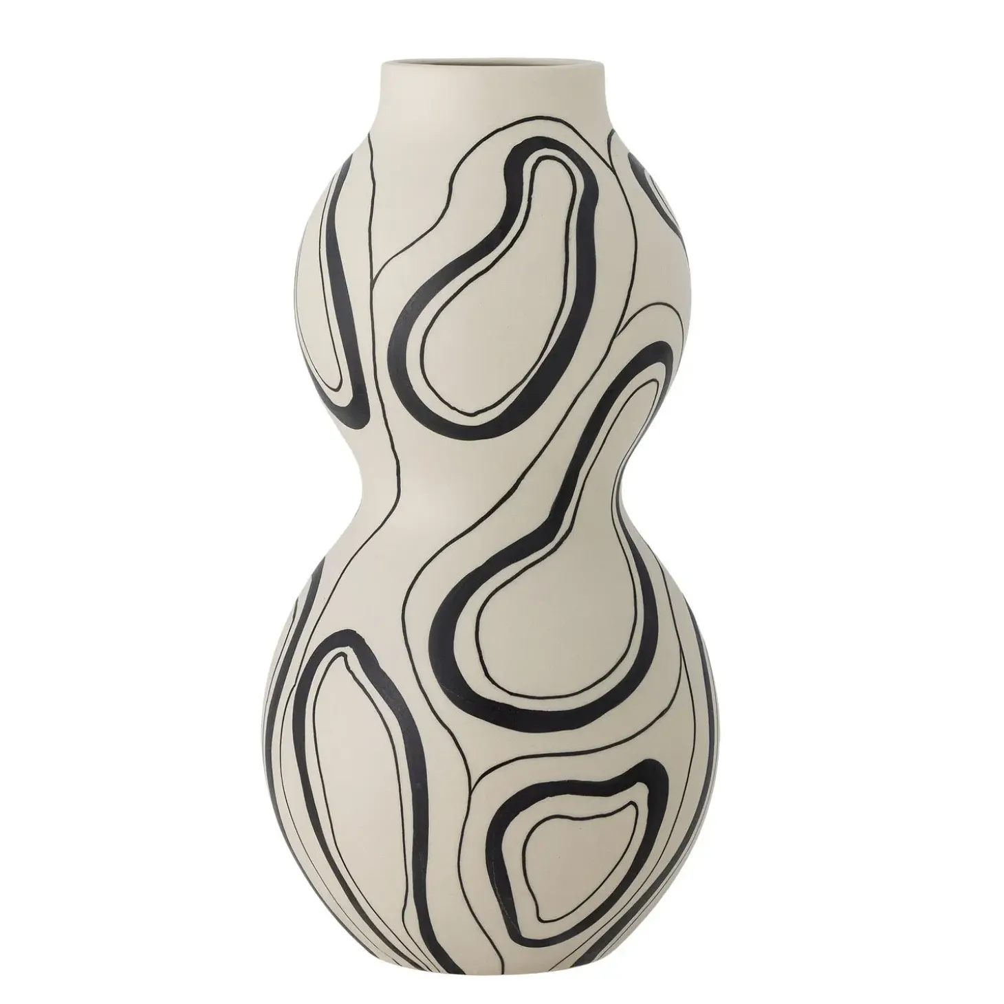 Denne håndlavede vase fra Bloomingville kombinerer en buet form med et sort bølget mønster på lys baggrund. Den silkebløde glasur giver vasen en særlig finish, der fremhæver det trykte mønster.