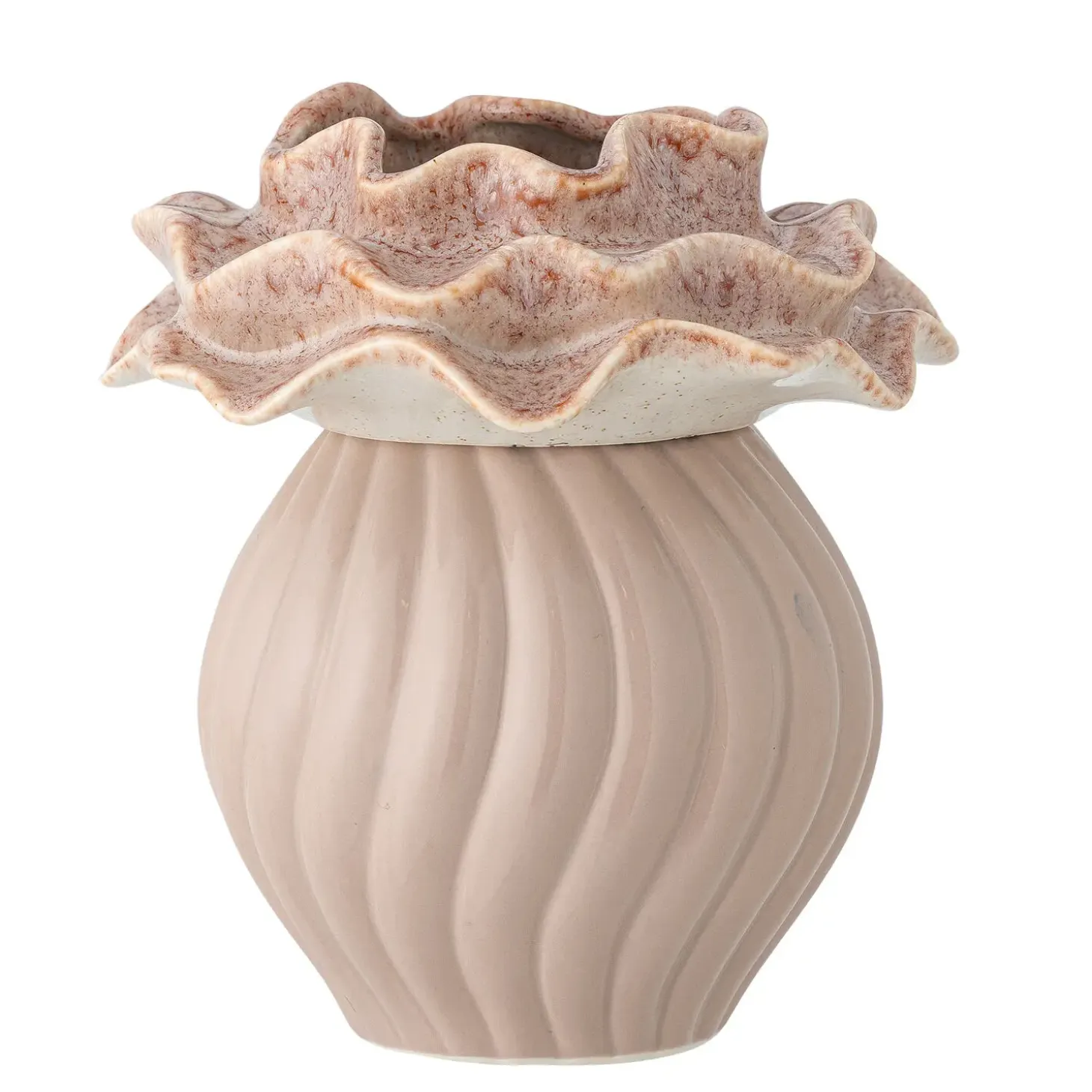 Denne Petalia-vase i stentøj kombinerer holdbarhed med et særpræget udtryk. Den bløde rosa nuance og den riflede overflade skaber en vase, der både er praktisk og dekorativ i din indretning.