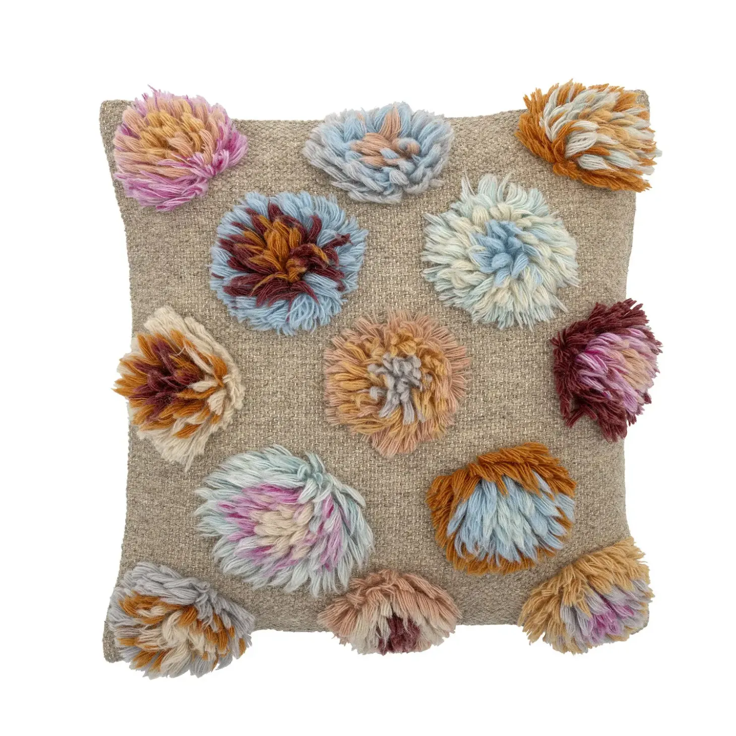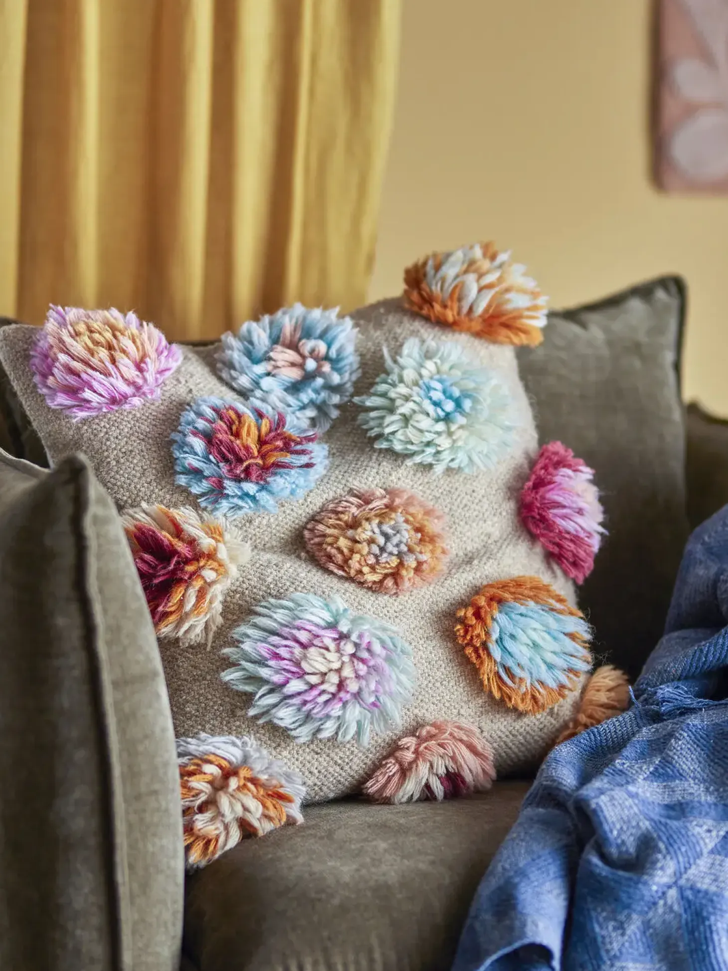 De farverige pomponer på forsiden tilfører liv til den blå grundfarve, mens bagsiden holdes ensfarvet for en rolig kontrast. Pudens væveteknik giver både karakter og holdbarhed til dit indretningsprojekt.