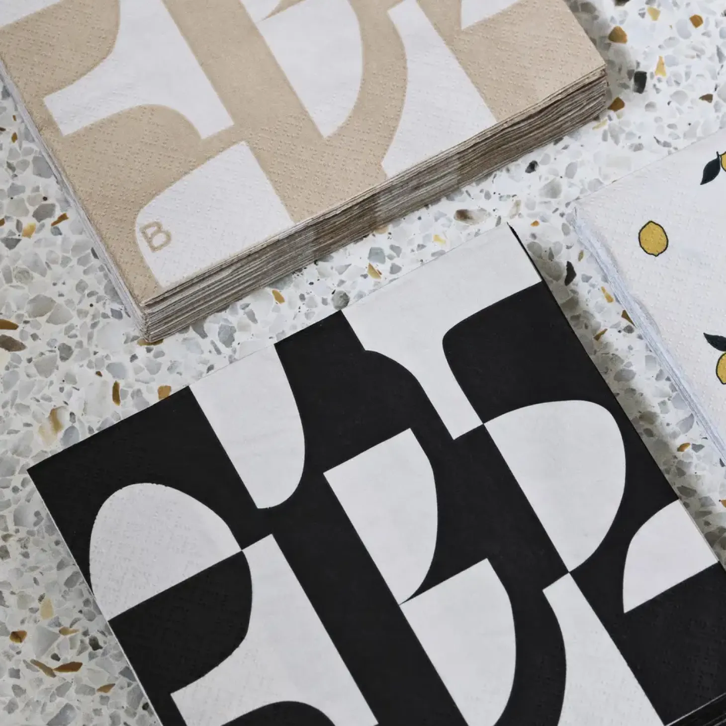 Papirservietter med et flot grafisk print i beige/hvid. Dæk dit bord og lad servietterne skabe et lille kunstværk på dit bord.