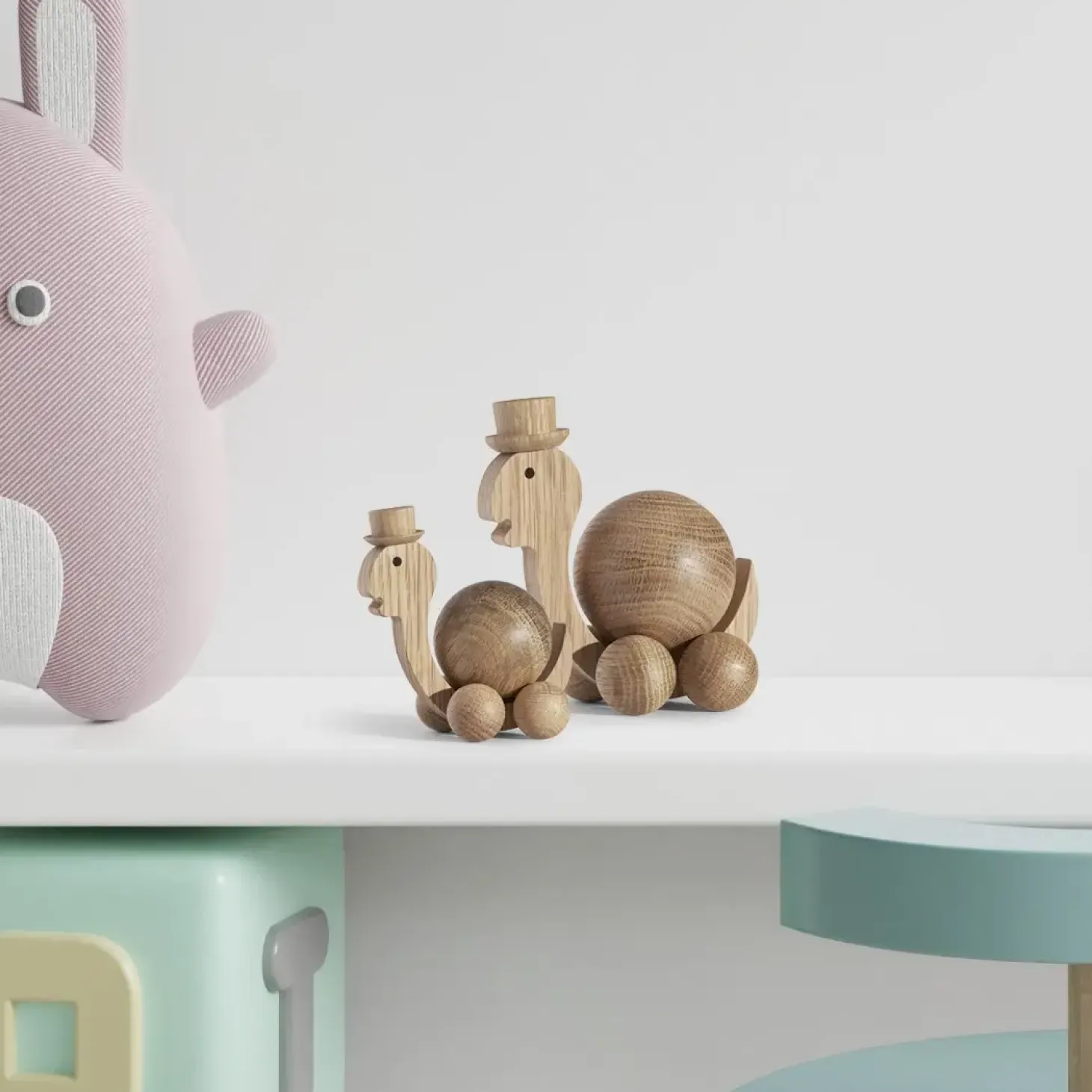 Den store kugle på ryggen, der symboliserer jordkloden, drejer rundt, når du bevæger træfiguren fremad.