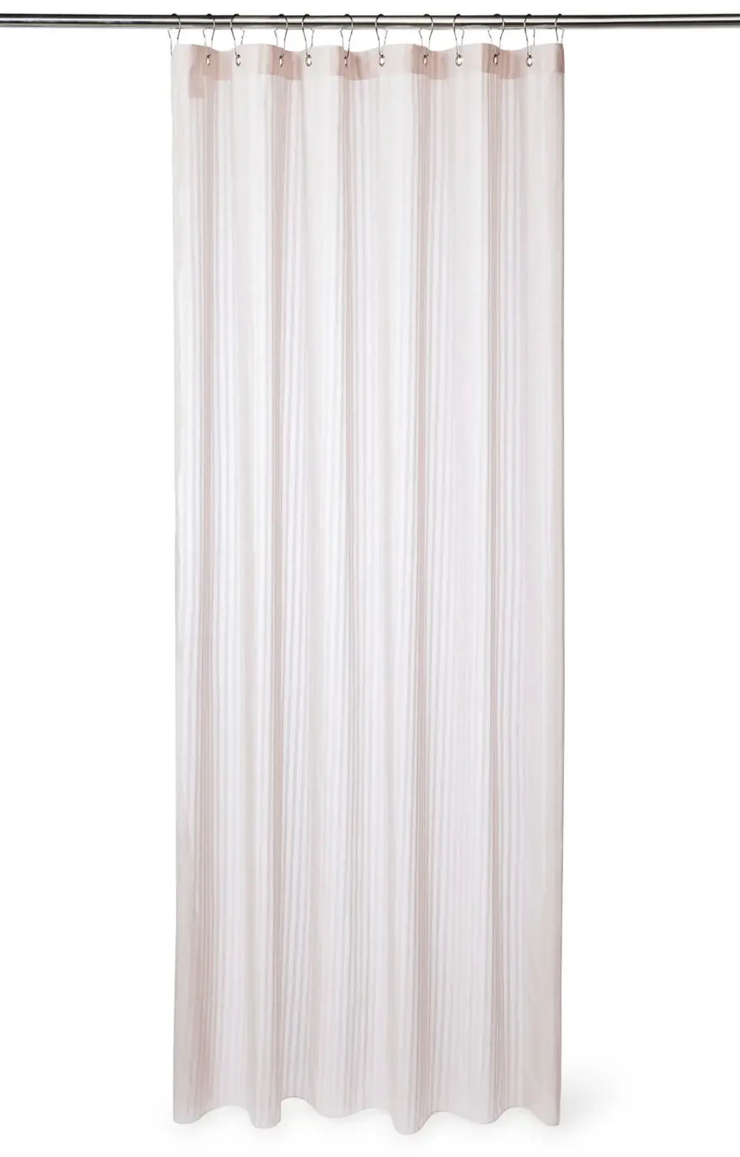 Dette badeforhæng i let stof med vævede striber giver dit badeværelse et roligt udtryk. Med standardmålene 140 x 200 cm passer det til de fleste brusekabiner og badekar.