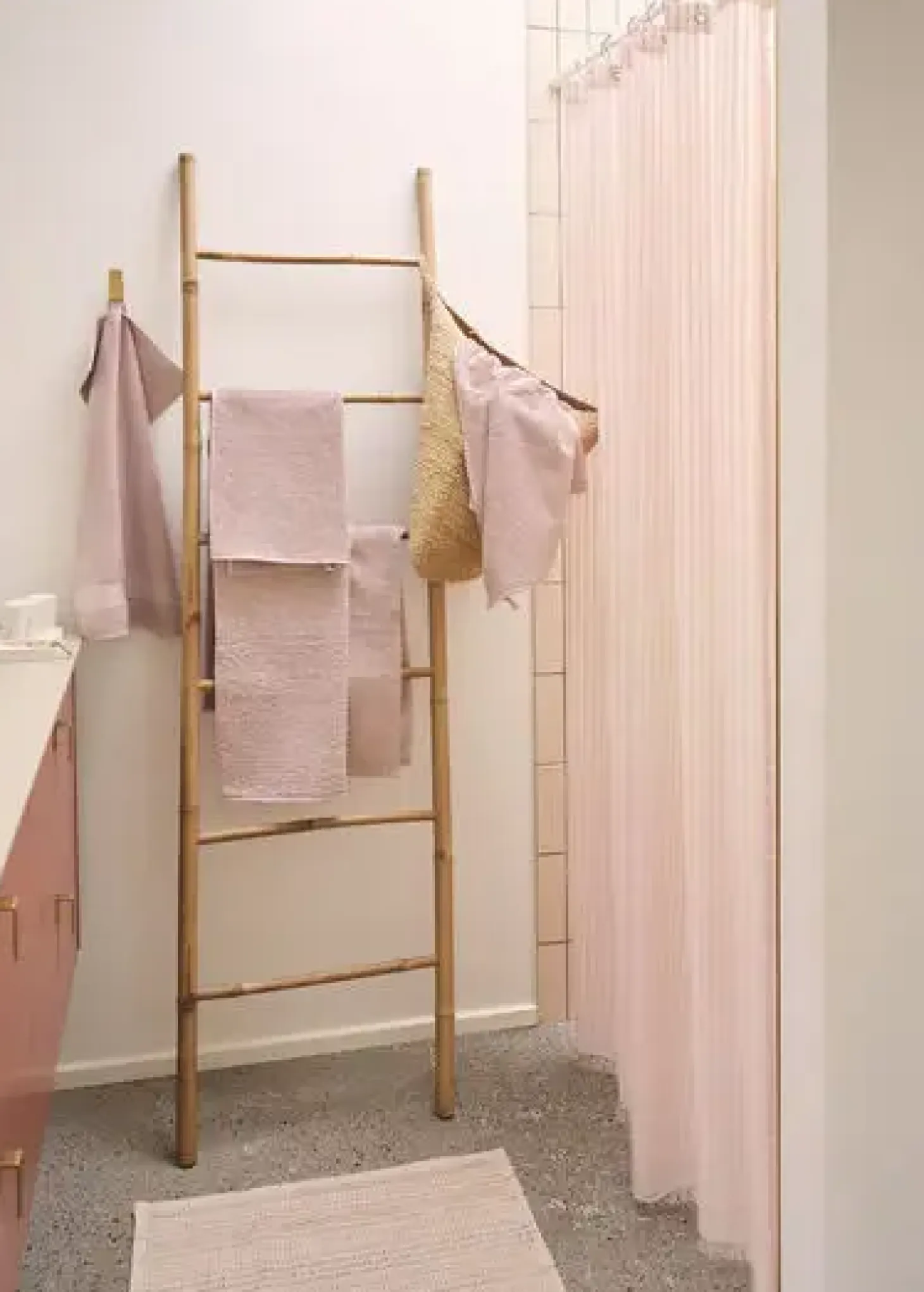 Dette badeforhæng i let stof har transparente tone-i-tone vævede striber, der skaber en fin dybde i den lyserøde farve. Stoffet lader lyset skinne igennem, mens det stadig sikrer dit privatliv i badet.