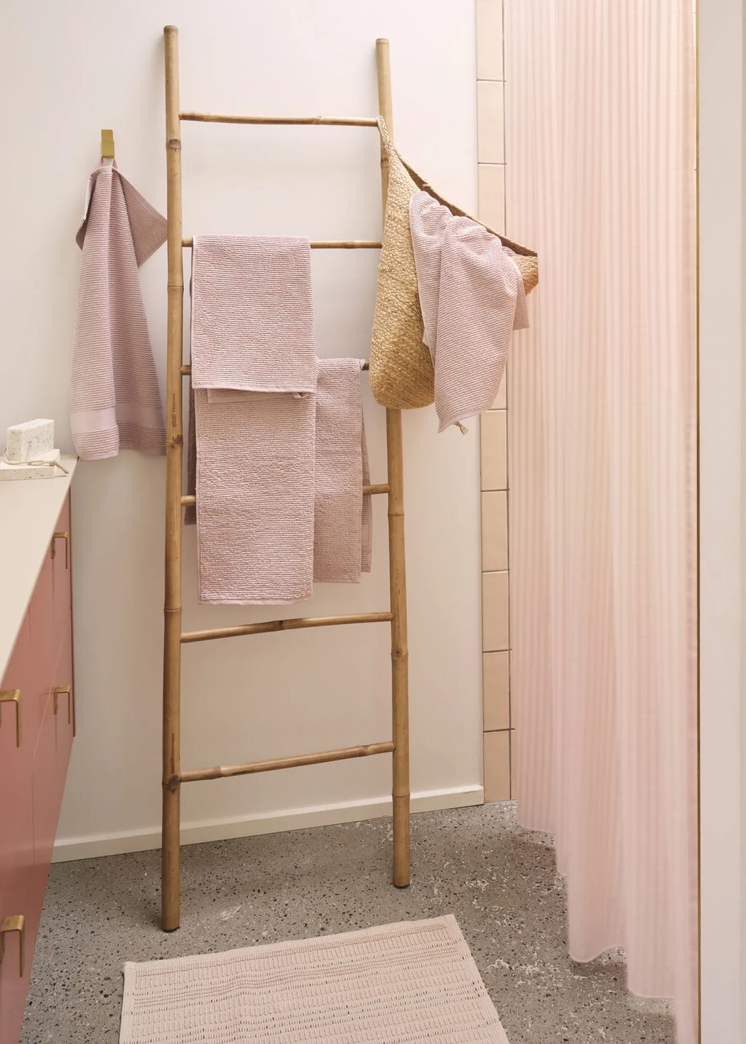 Det indsyede rynkebånd gør ophængningen nemt og sikrer, at forhænget falder naturligt. De vævede striber skaber en subtil struktur, der bidrager til badeværelsets rolige atmosfære, mens den rosa nuance tilføjer et blødt touch.