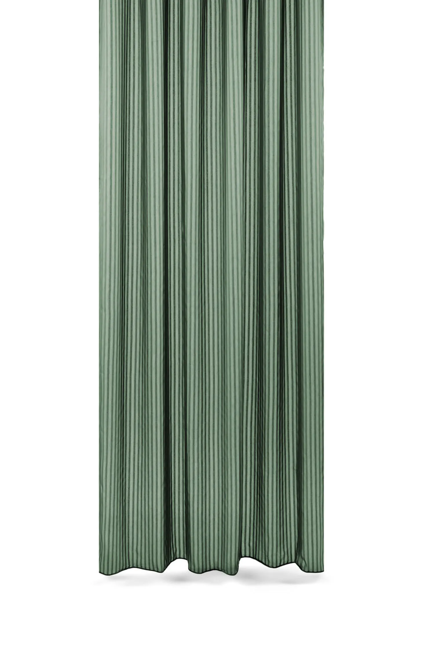 Dette badeforhæng i skovgrøn nuance med transparente striber giver dit badeværelse et roligt udtryk. Forhænget er syet med rynkebånd, der sikrer et jævnt og flot fald, når du hænger det op.
