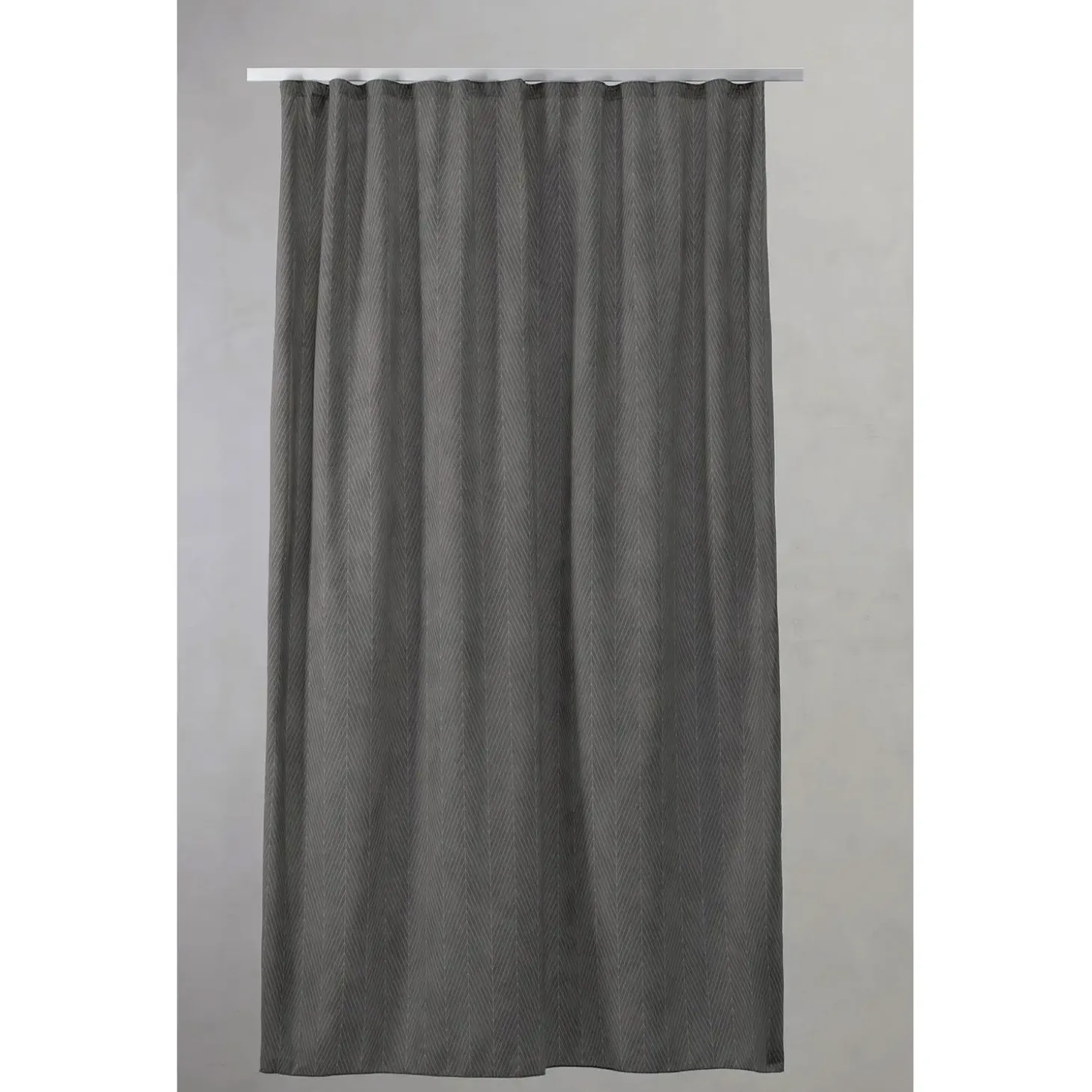 Rynkebåndet i toppen sikrer, at forhænget falder naturligt og dækker, hvor det skal. Det printede sildebensmønster med vandeffekt giver et diskret udtryk, der passer ind i de fleste badeværelser. Chevronmønsteret skaber en subtil dybde i det mørkegrå design.