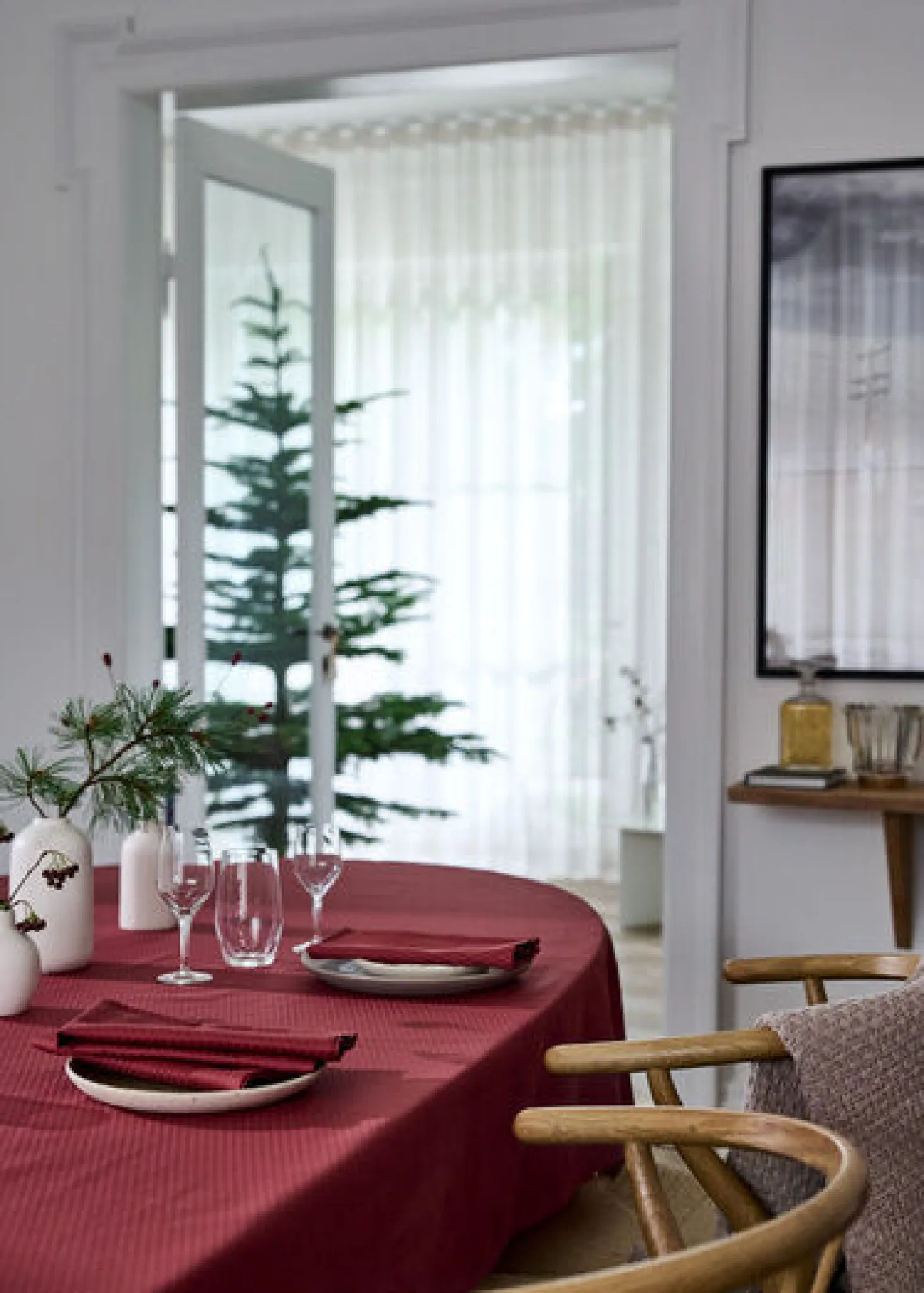 Klassisk damask stofserviet i rød. Tile Damask stofservietter er underspillet luksus i 100% bomuld, med et fint mini-jacquard mønster. Fuldend en smuk borddækning med matchende Tile Damask dug. Alle Compliments servietter er naturligvis certificerede med Standard 100 by Oeko-Tex.