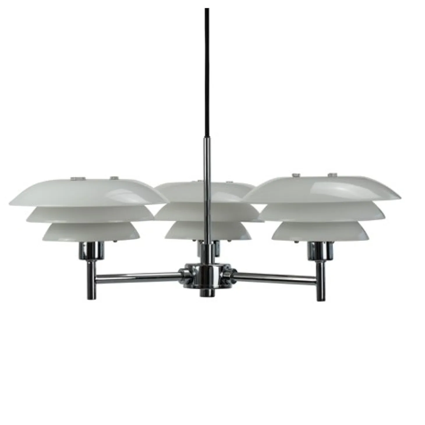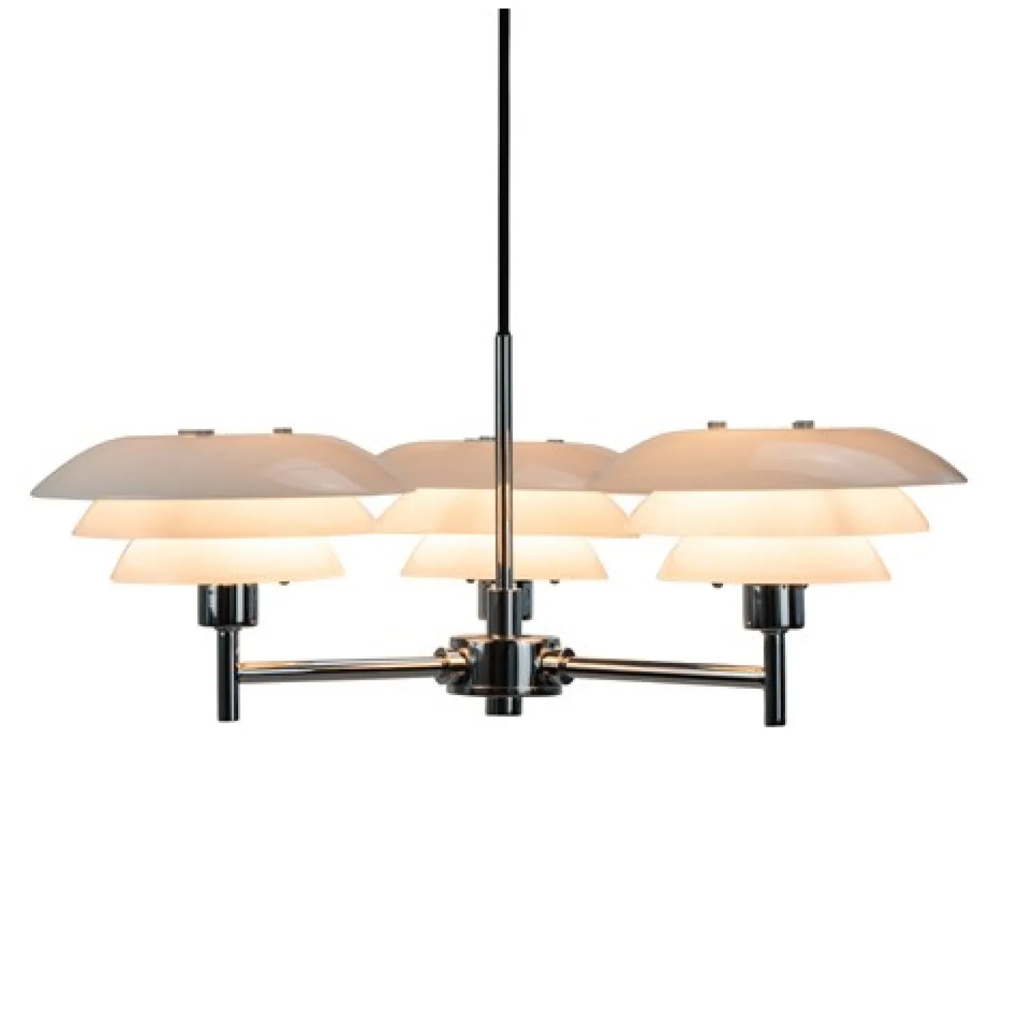 DL20 Opal lysekronen med en base af krom har et klassisk og enkelt udtryk med sine tre skærme i opal-glas. Alle lampeskærme i opal-glas fra Dyberg Larsen er mundblæste, hvilket gør hver enkelt lampe unik. Lampen giver et godt lys uden at blænde, og giver et elegant udtryk fx over spisebordet.