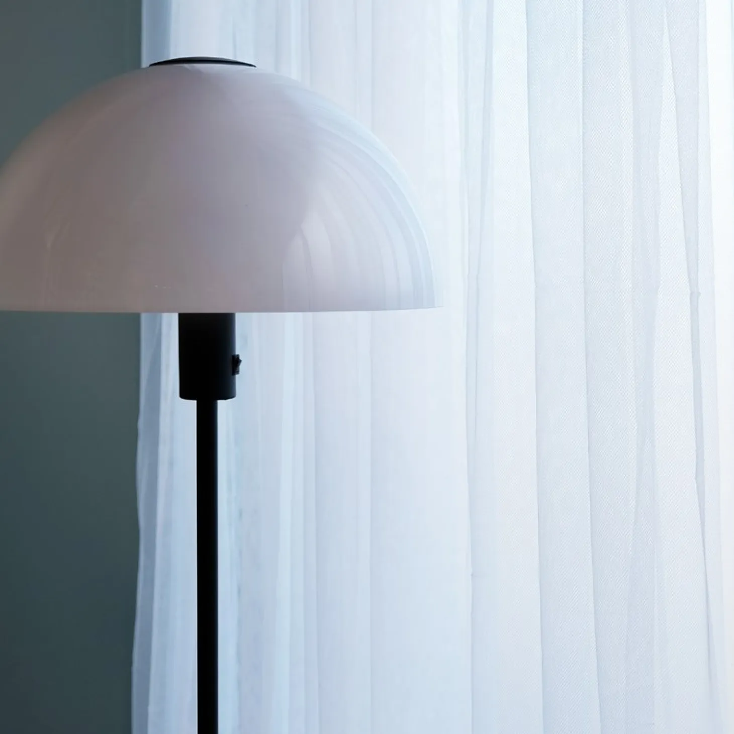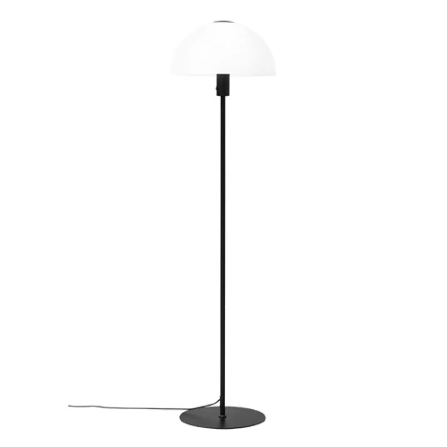 Gulvlampe i opalhvid glas og matsort metal. Det mundblæste glas giver en flot og behagelig belysning. Stofledningen er med til at gøre lampen elegant og moderne.